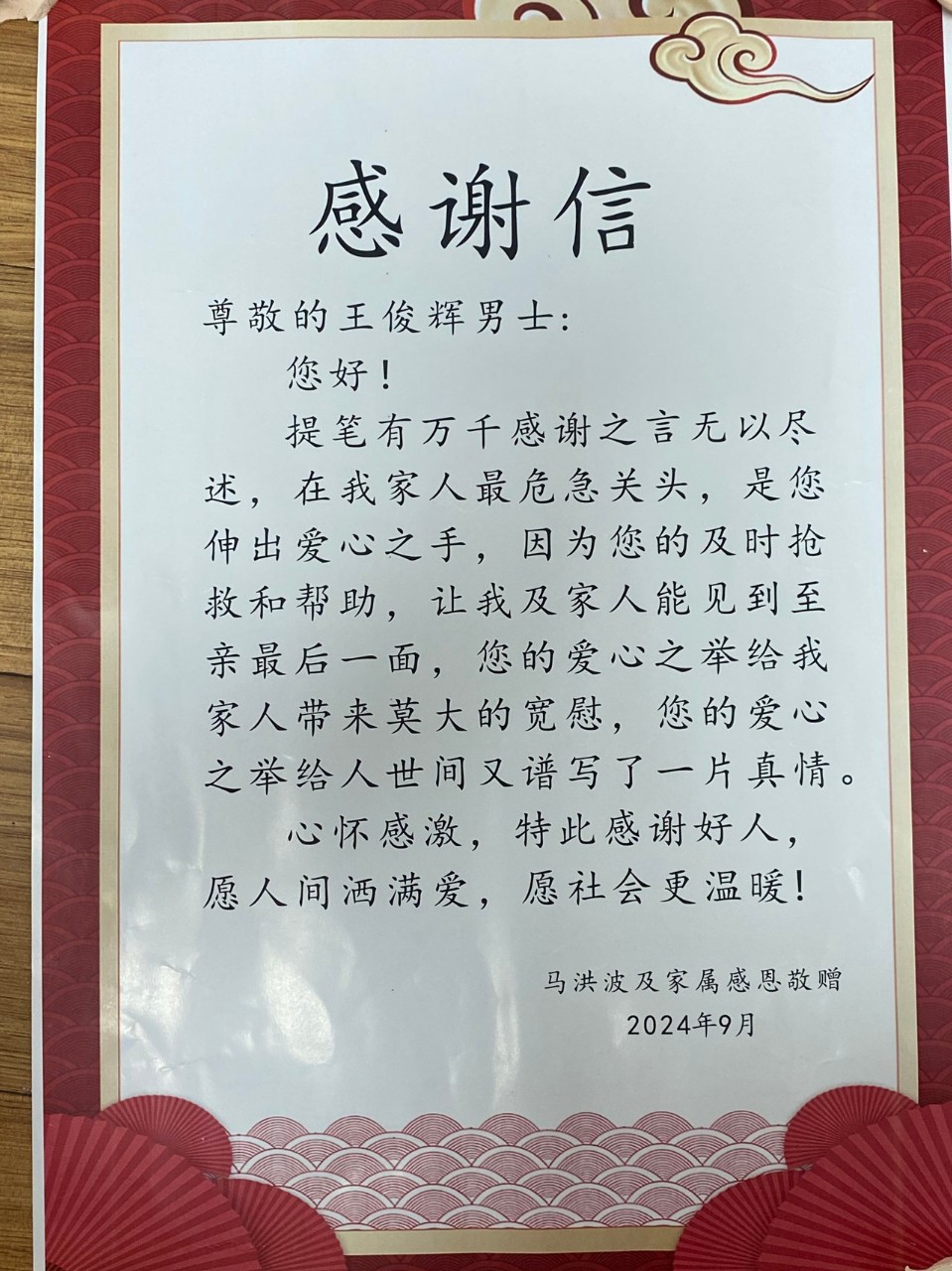 9月9日,老人家属在警方的协助下前往云南省中医医院口腔科,找到了实习生王俊辉同学。患者家属将一面写着“救人不留名,品德扬千秋”的锦旗和感谢信送到云南省中医医院口腔科王俊辉同学手中,表达感激之情。面对医院、学校的赞誉,王俊辉同学表示危难之时救人是作为一名医学生的本能反映,也是健康所系、性命相托的职责所在。
