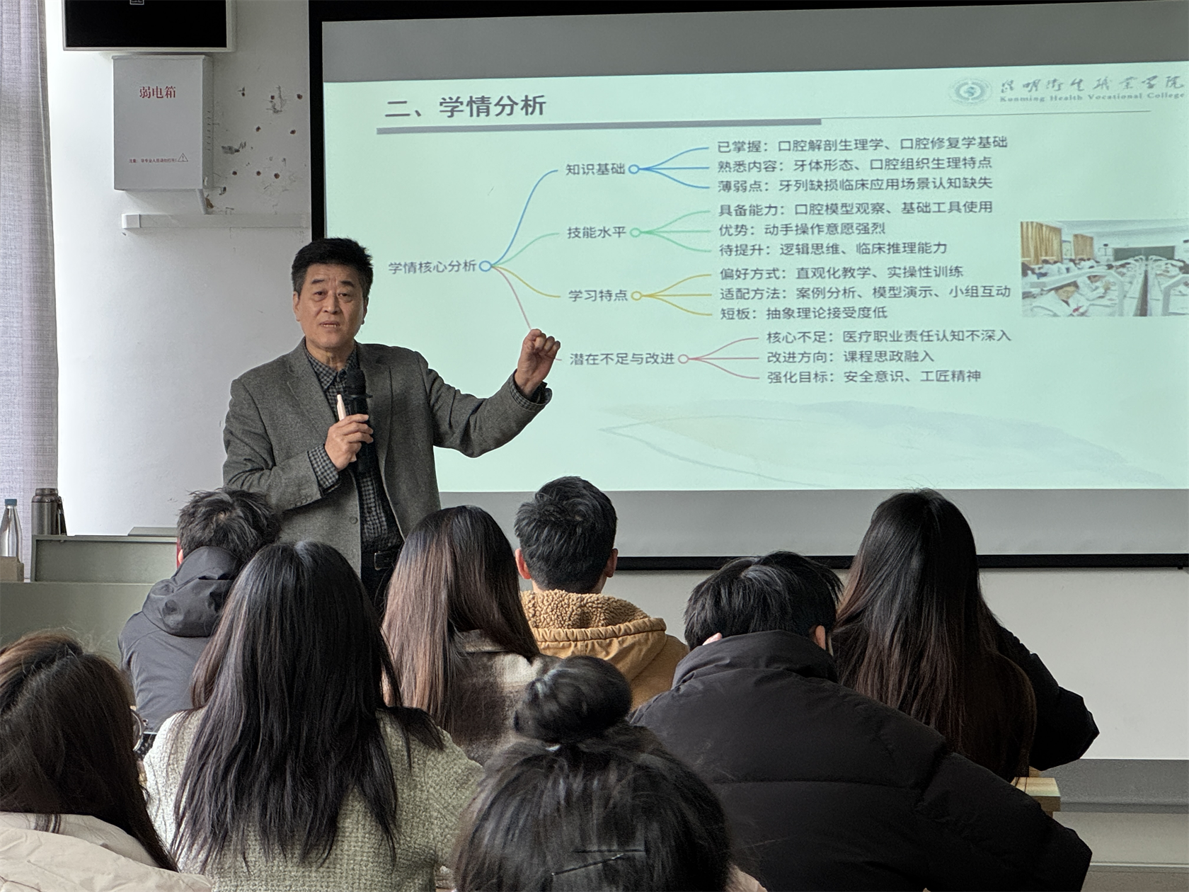 指导环节中,王玉孝教授以《可摘局部义齿修复工艺技术》中的《牙列缺损分布状态分类》为教学范例,构建了兼具理论深度、实践指导性与教学艺术性的示范体系。在教学策略优化与教学媒体融合应用方面,王教授系统阐释了案例教学法、问题导向学习的协同运用路径,引导青年教师构建沉浸式课堂思维互动场景,从课件可视化设计到教学语言表达艺术等维度,提供了全流程教学效能提升方案。针对抽象知识传授难点,他强调可依托人工智能技术赋能教学设计,通过人工智能数字资源生成思维导图、解剖可视化模型、生理机制动态演示等数字化教学资源,实现知识传播的高效化。