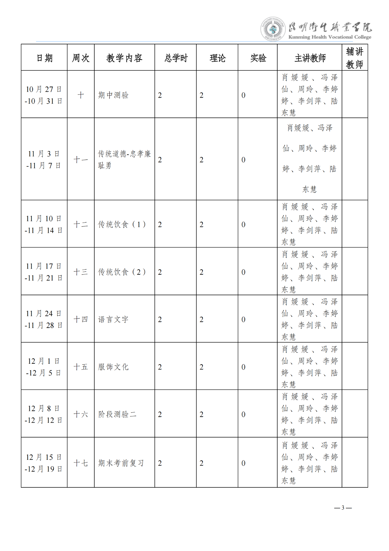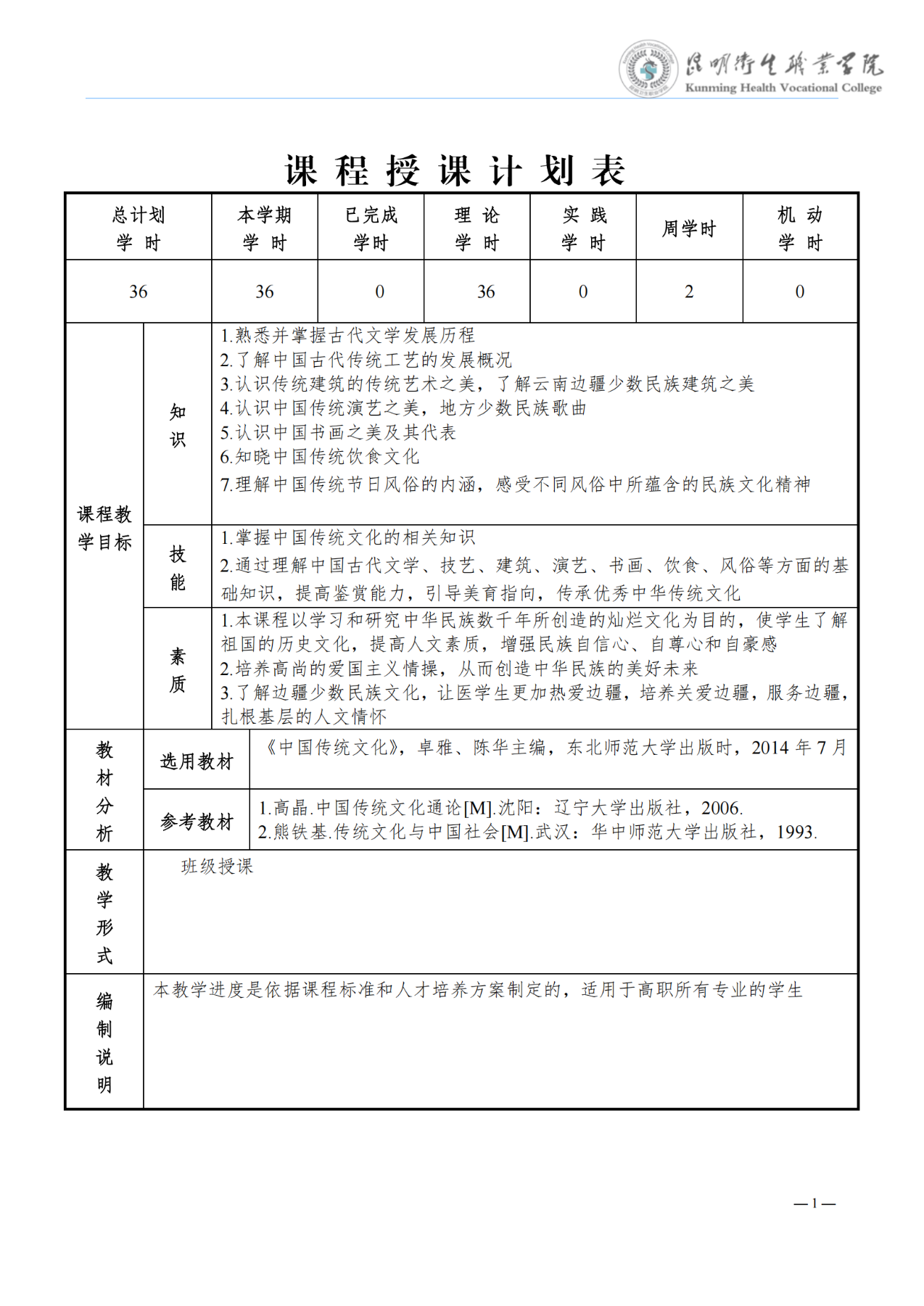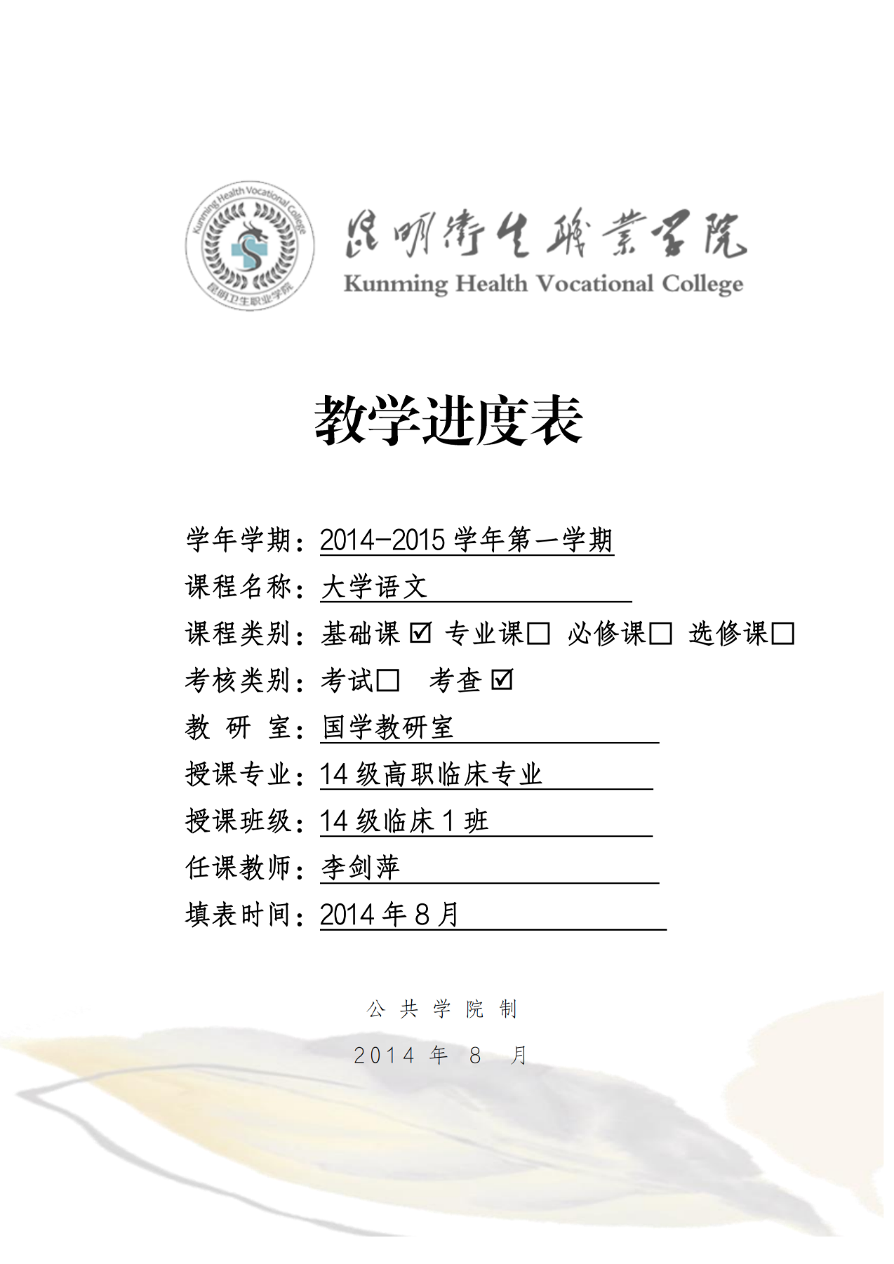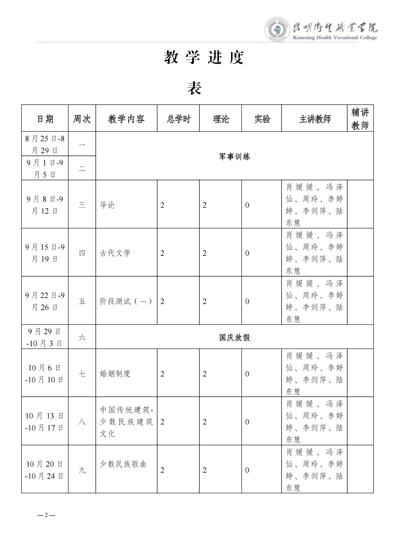 《大学语文》教学进度表