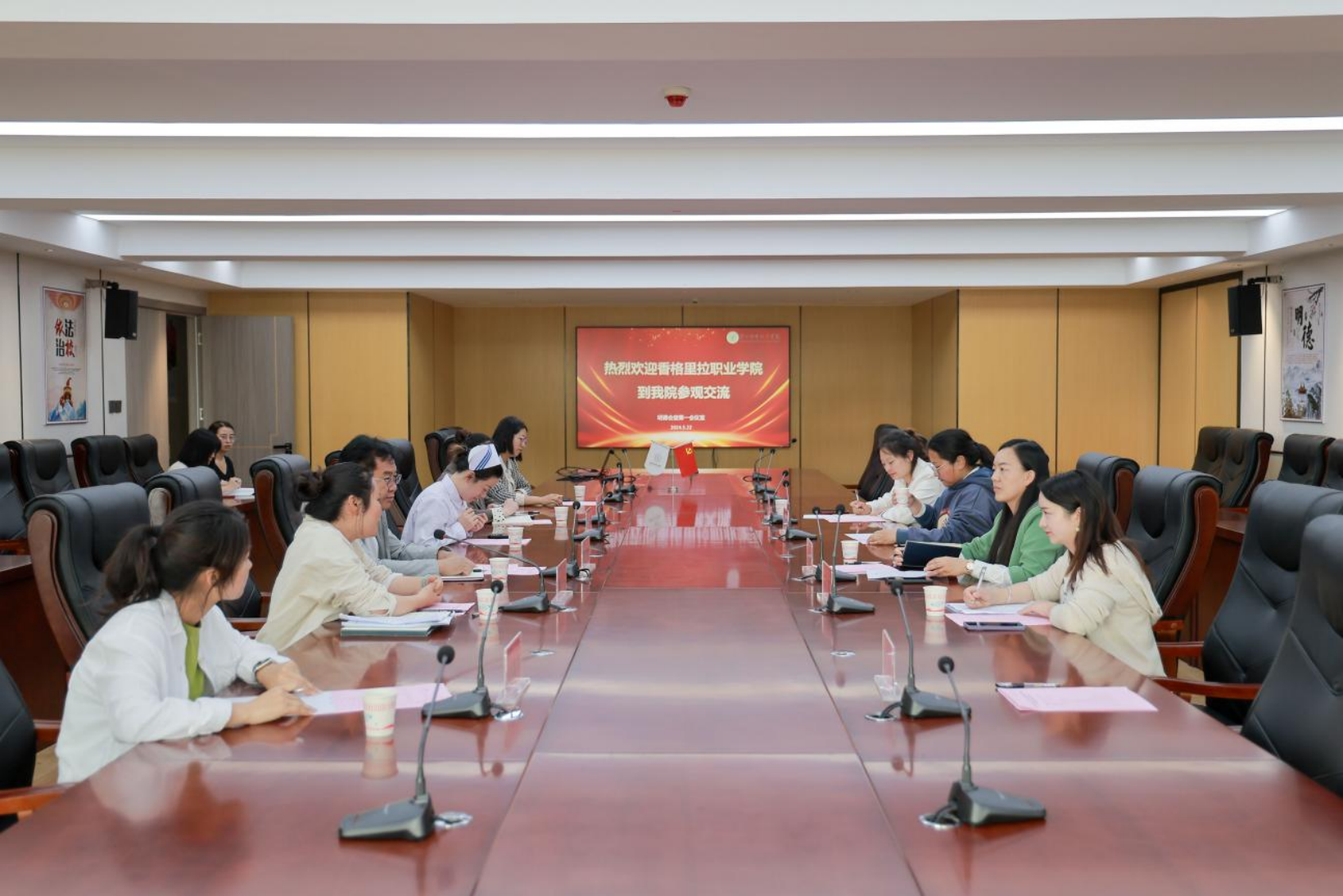 参观结束后,双方在学院明德会堂第一会议室开展交流座谈会。张尤松副院长代表学院致欢迎词并介绍学院办学理念、办学特色、办学成果。来访领导认为学院教育教学工作有特色、有内涵、有成效,值得学习借鉴,并简要介绍了香格里拉职业学院的组建情况、当前形势、面临挑战和调研目的。双方就教学管理、师资培养、育人模式、康复治疗技术专业办学和实训基地建设方面开展交流座谈。