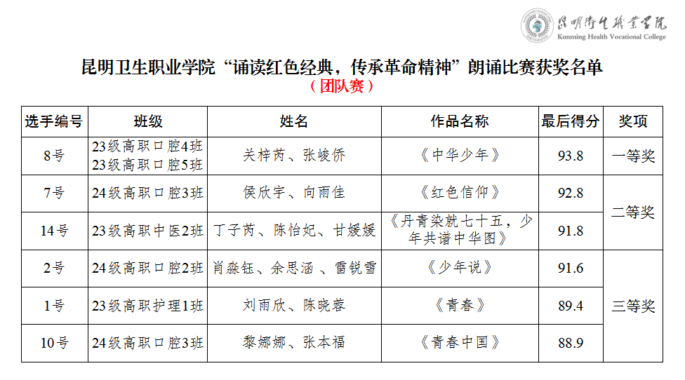 经过激烈的角逐,团队赛由23级高职口腔4班5班关梓芮,张峻侨带来的《中华少年》摘得桂冠;侯欣宇,向雨佳,丁子芮,陈怡妃,甘媛媛五名同学荣获二等奖;肖淼钰,余思涵,雷锐雪,刘雨欣,陈晓蓉,黎娜娜,张本福七名同学荣获三等奖。个人赛由22级五年制护理2班殷敏带来的《月光下的中国》摘得桂冠;陈娅妮,王四雪荣获二等奖;熊明重,黄子珊,孙园睿荣获三等奖。
