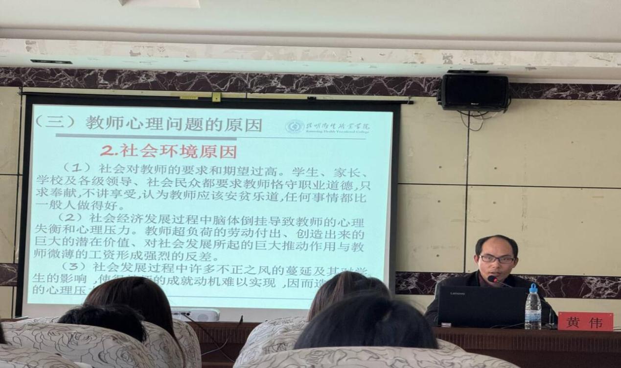 黄老师阐释“师者,传道受业解惑也!”,指出教师的工作不仅要向学生传授知识及培养优良品质,还要促进学生的身心健康。然而在信息时代,知识变化速度过快,自我期望值过高等也会导致教师产生职业倦怠和心理压力。