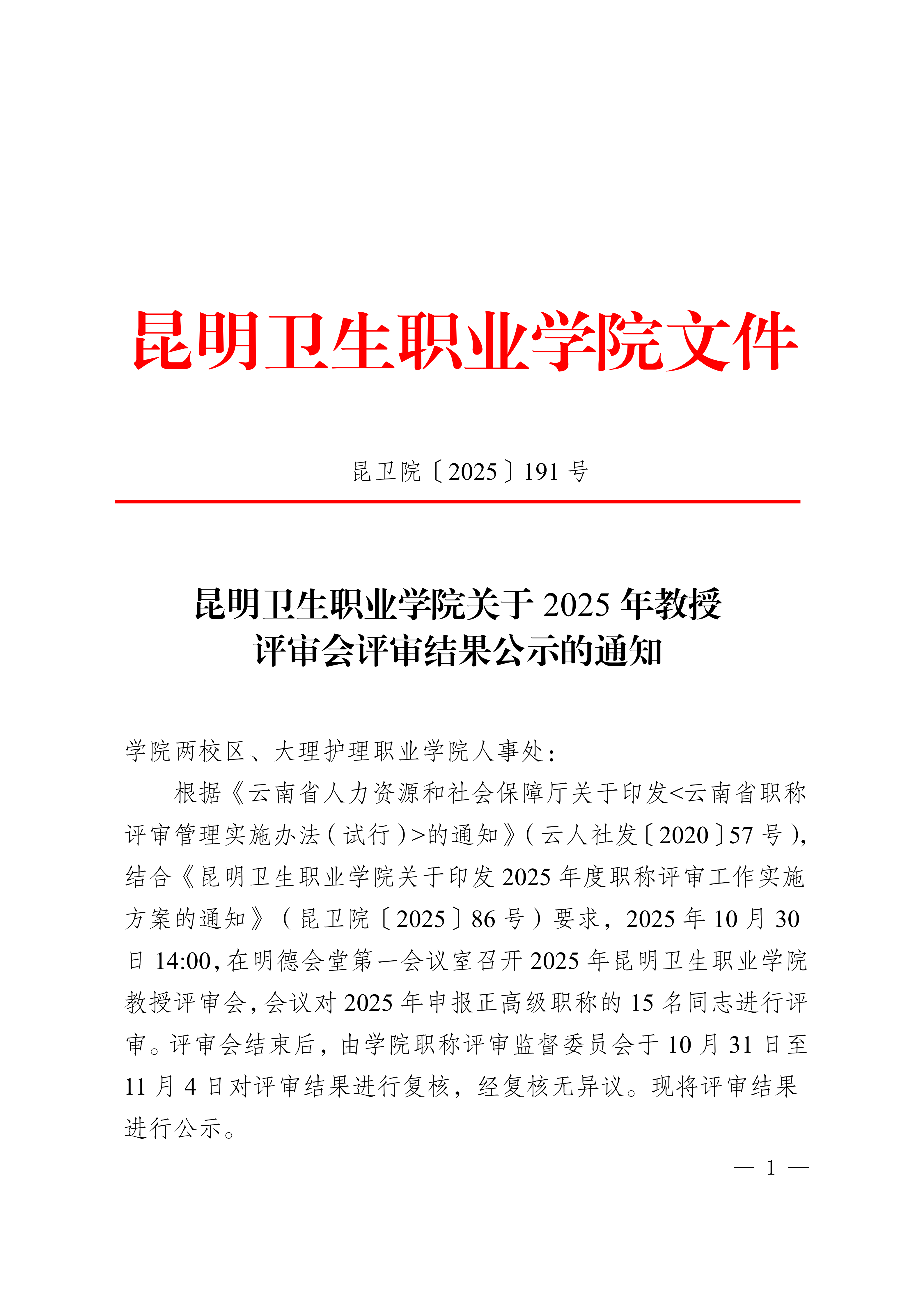 昆卫院〔2025〕191号 XK星空关于2025年教授评审会评审结果公示的通知