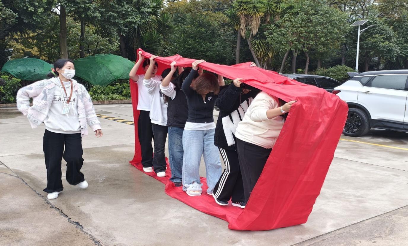团体赛“开火车”是心理思愈团的招牌活动,此项游戏需要以班级或团体形式组织5-7人参赛,在红色圈形布条中,通过手臂上举撑住红色布条,团队成员协调配合,在计时内从规定起点走至终点。“开火车”游戏虽然规则简单,却能在过程中考验团队合作与协调反应速度。让团队氛围变得活跃而充满动力,通过这项游戏,能够让同学们深刻体会到团队的重要性,大家在团队中需要相互支持,相互信任,因为每个成员都是团队中不可或缺的部分。
