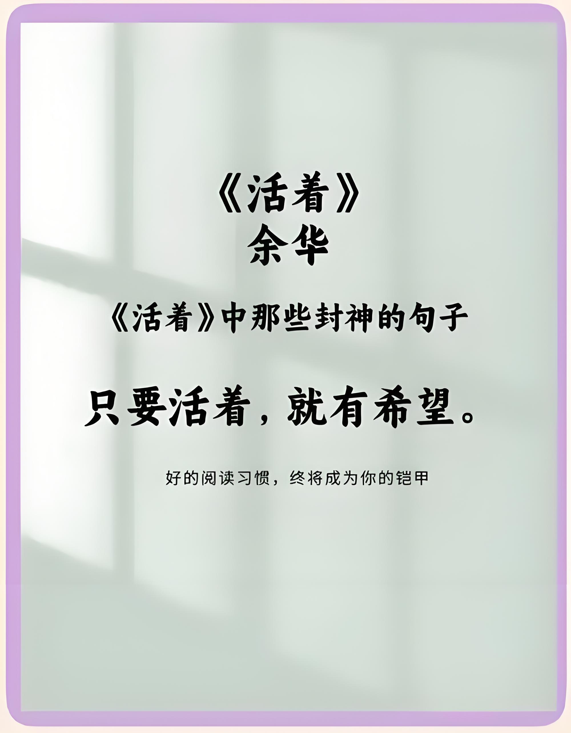 《活着》在我看来,它不仅是一部文学作品,更是一本人生哲学的教科书。教会我们如何在逆境中寻找希望,如何在艰苦中发现生活的美好,如何在生活的旅途中以爱之名,继续前行。之所以推荐《活着》这本书的原因是:不管是书中还是现实有些事和人都会经历,而爱,作为《活着》的核心主题,贯穿整本书中,人生的意义在于“活着”本身。无论是福贵的故事,还是生活中自己的故事,我们都应该珍惜自己的生命,用自己的方式“活着”。