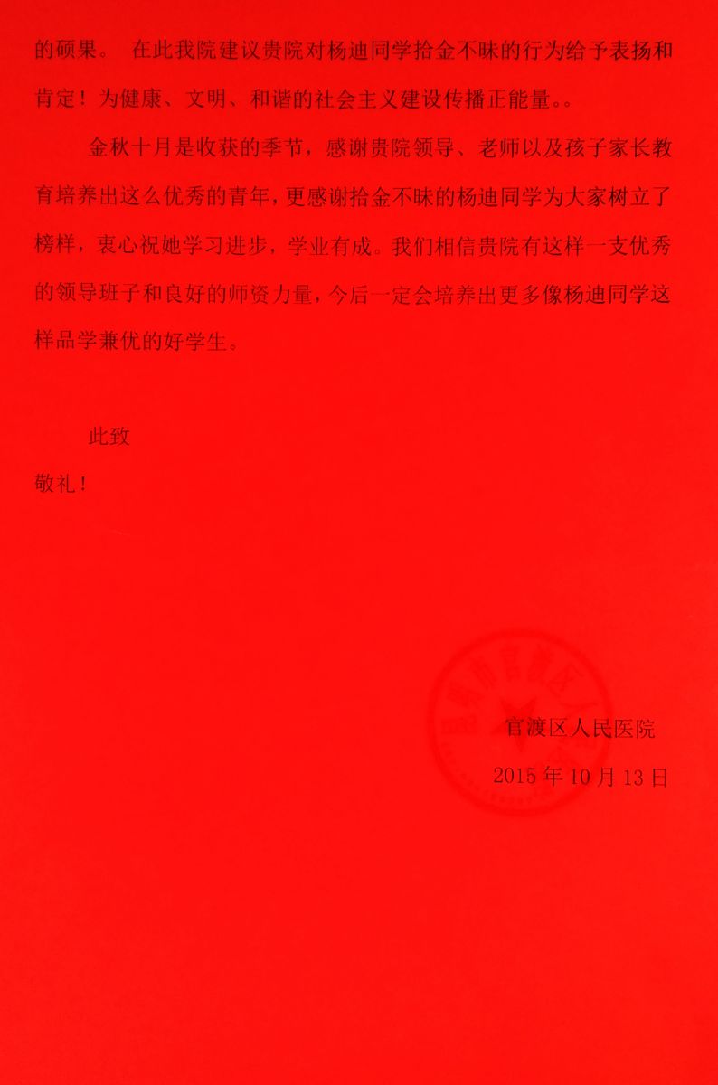 官渡区人民医院发来XK星空实习生杨迪同学拾金不昧表扬信