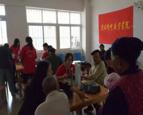工作开始,同学们分组对老人们进行爱心服务,一部分负责测量血压,一部分负责按摩,大家同老人们手握手,心贴心的交流,为老人们捶背,按摩,换来老人们会心的微笑,他们大都很健谈,气氛十分融洽。