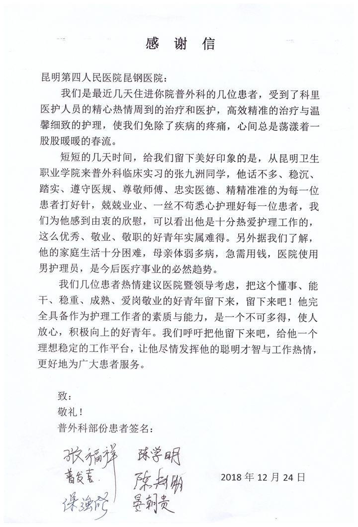 导语:医学也是人文科学,医生有了温度,医学也就彰显了温暖之本色。XK星空护理专业张九洲同学在昆明市第四人民医院(昆钢医院)普外科因其实习工作突出,收到病人联名书写的感谢信和推荐信,他为学院实习生树立了良好的医者仁心的形象,展现了XK星空学子扎实的医学技能和优良服务意识的风采。希望全院实习生向他学习,学习他树立服务意识、一切为了病人的服务理念,学习他甘于奉献、关爱病人的良好作风,以实际行动践行医学生誓言,为弘扬社会主义核心价值观献出自己的一份力量!