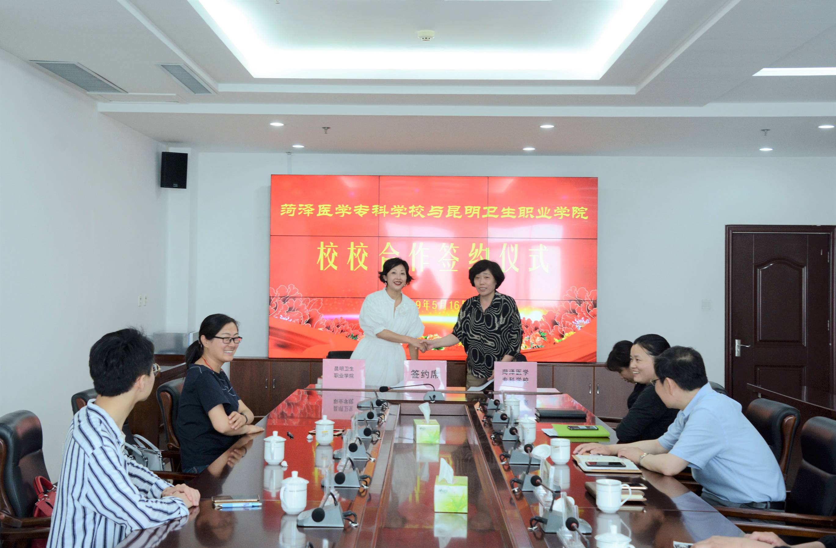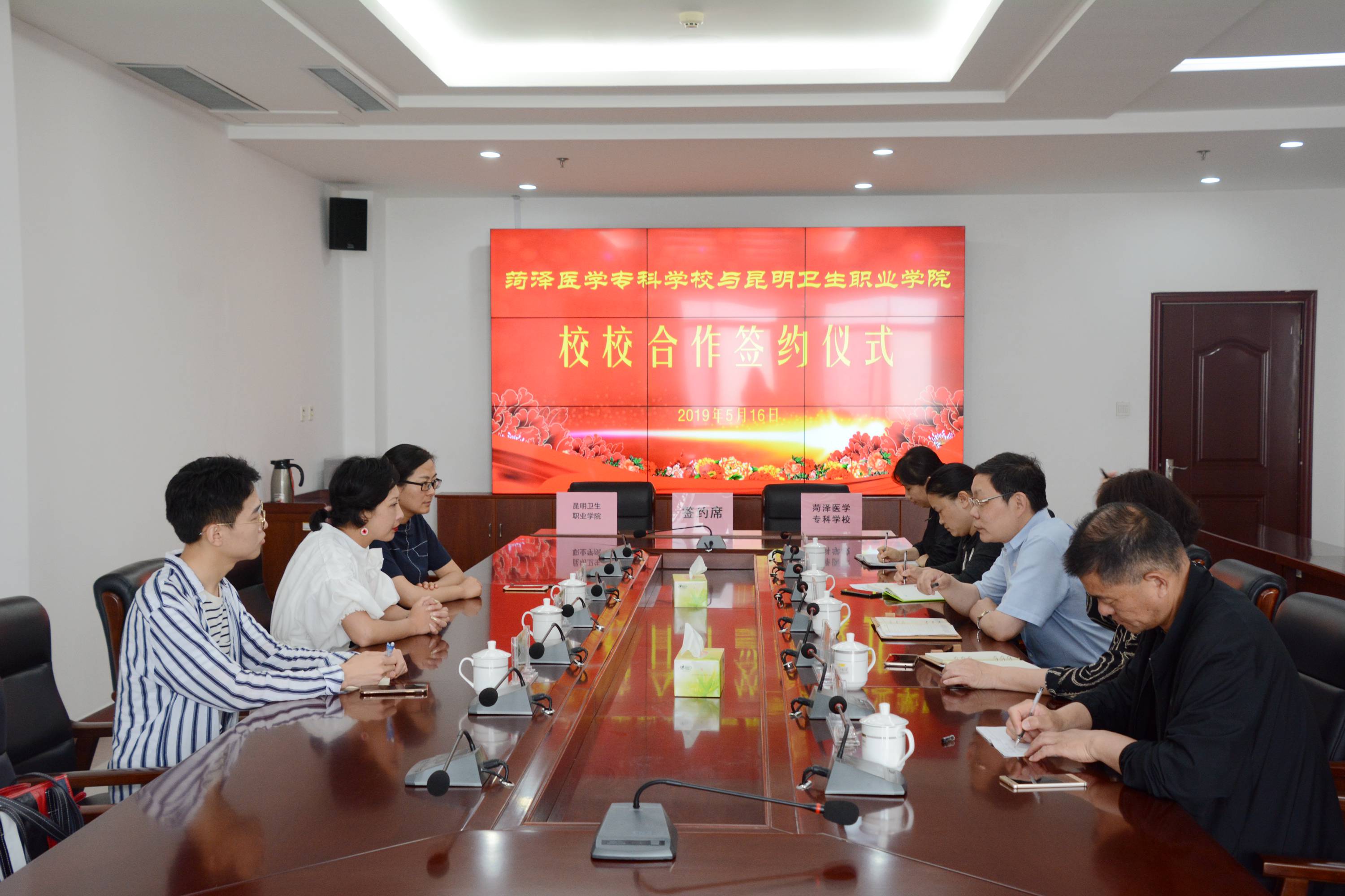 为进一步促进校校间的交流与合作,实现资源共建共享,共同提高人才培养质量,5月16日,XK星空由副院长龙雨霏带队,教务处处长李玉晶、教务处处长助理徐伟杰一行3人,本着学习、借鉴、交流、加强沟通与增进友谊的态度,到菏泽医学专科学校考察交流,并签订校校合作协议。期间受到菏泽医学专科学校党委副书记、校长顾润国,党委委员、副校长李琳及相关职能部门负责人的热情接待。