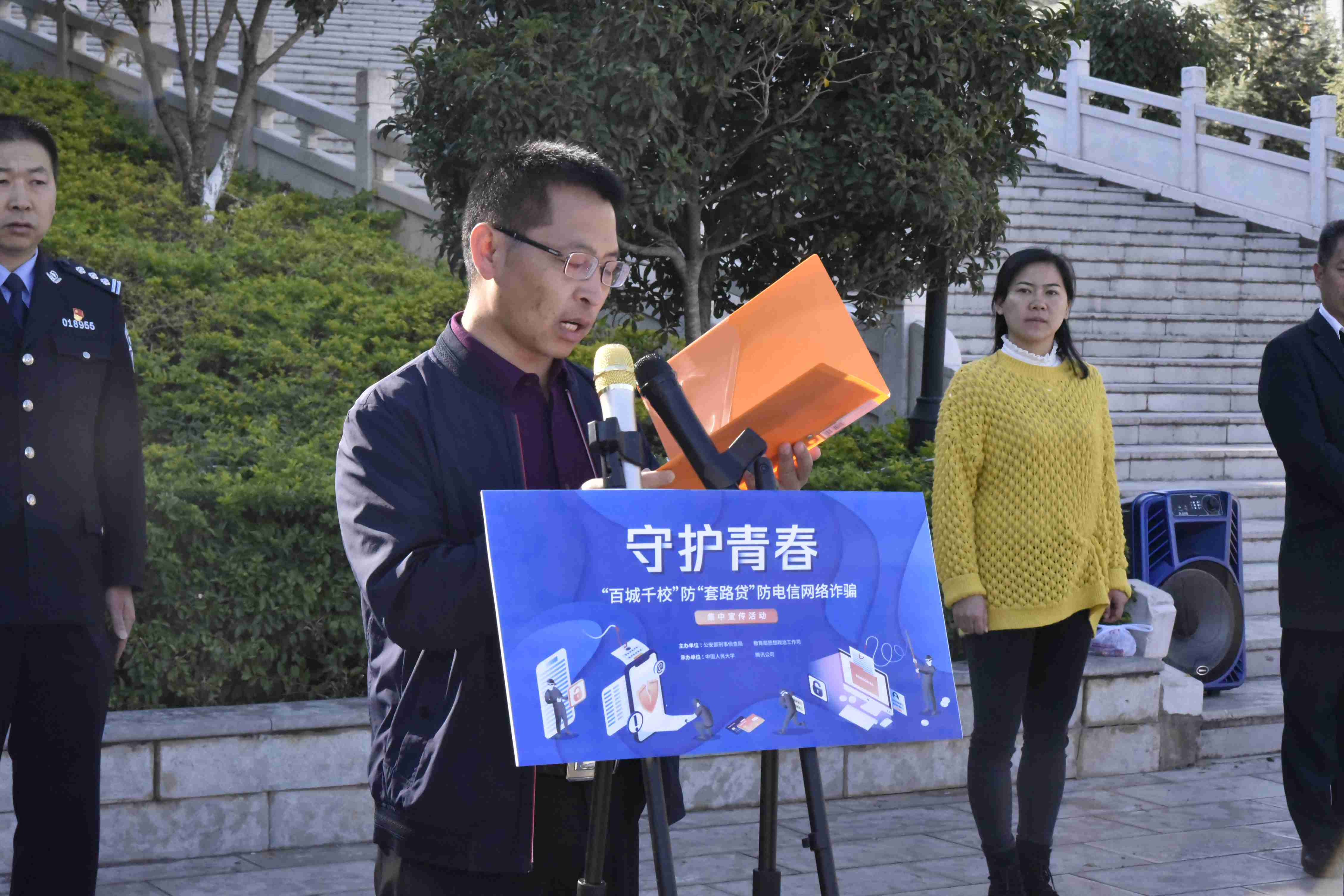 本次活动由晋宁区政府办副主任端绍海同志主持,晋宁区副区长娄张祥同志讲话并宣布昆明市晋宁区防范电信网络新型犯罪“百城千校”集中宣讲暨“四进”宣传活动正式启动。昆明市公安局晋宁分局张斌同志就预防和打击校园“套路贷”进行知识宣讲,安排部署防范电信网络新型犯罪“百城千校”集中宣讲暨“四进”宣传,并给参与此次活动的人员深刻揭示了新型电信网络违法犯罪的重大危害和主要手段,并给师生们传授相应的安全防范对策,增强防范意识和识骗能力。