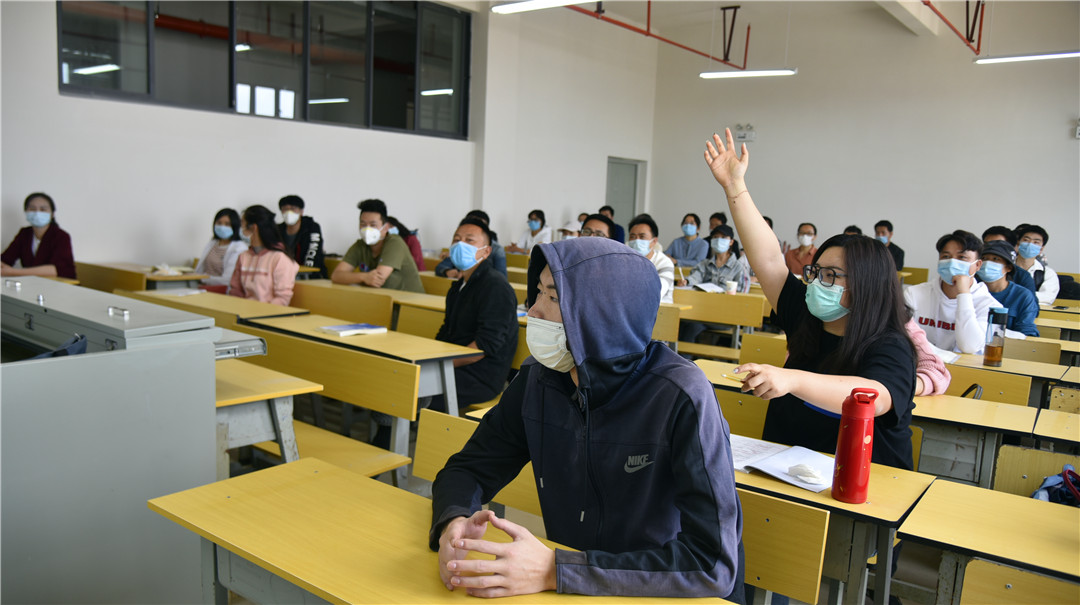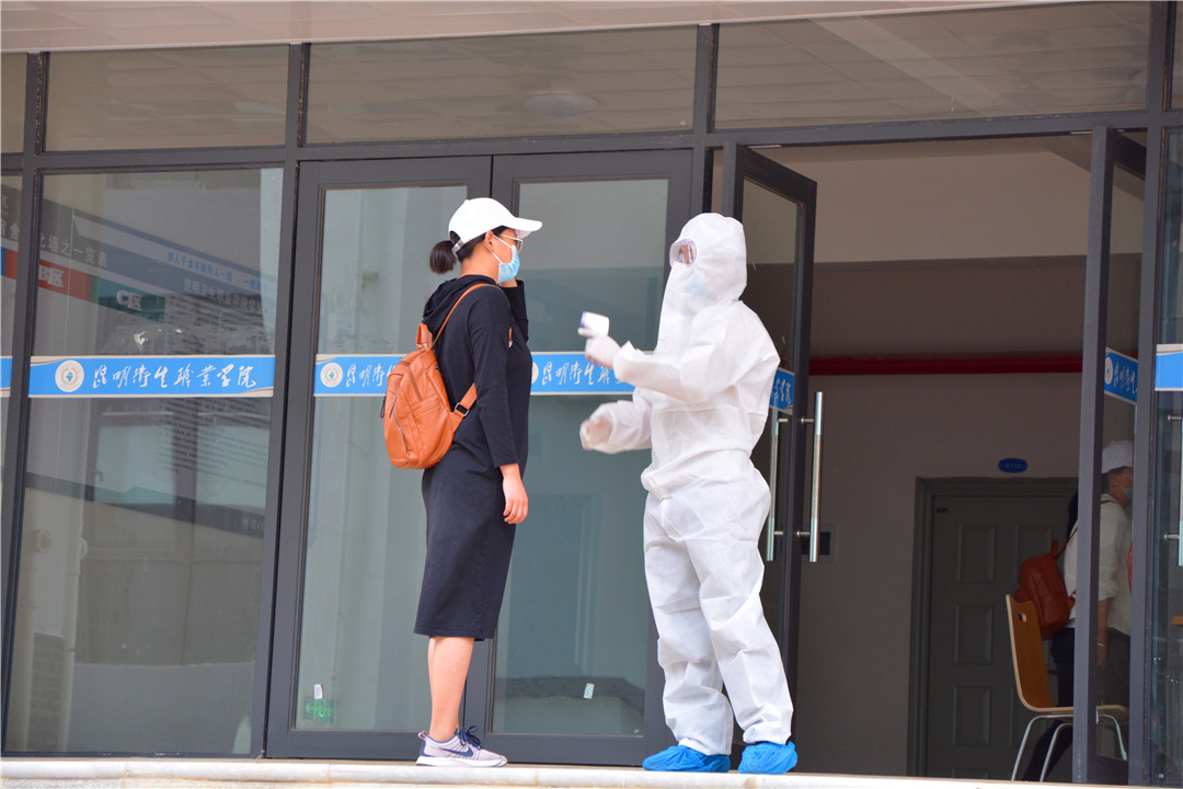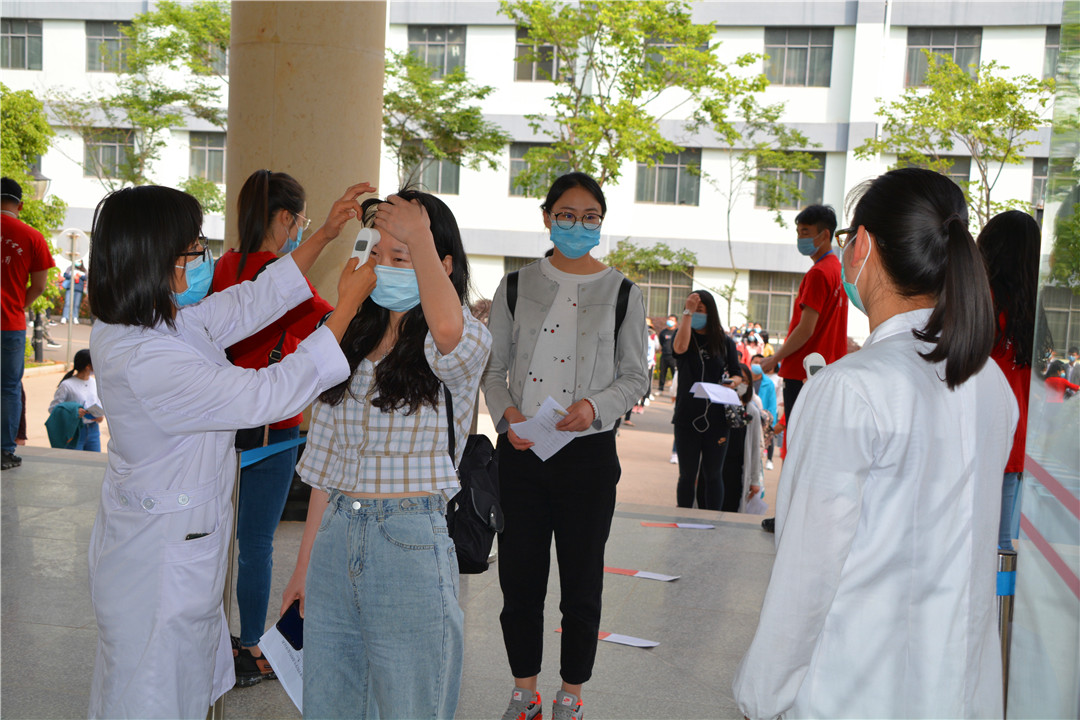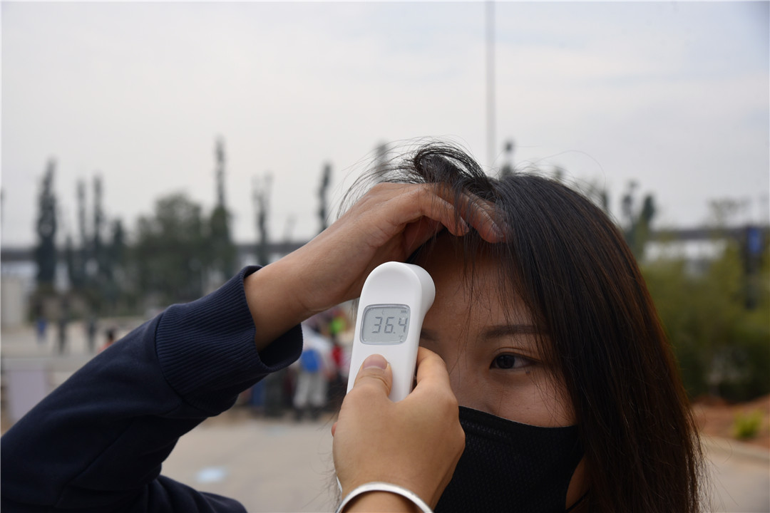 教学楼设置统一的入口和出口,相关区域设置清晰的标识指引,师生们有序排队进入教学楼并保持一米以上间距。教学楼门口有专业人员和志愿者进行体温检测、证件检查等,体温正常且携带有效证件的人员方能进入。学生进入教室后,分隔就坐,保持安全距离。