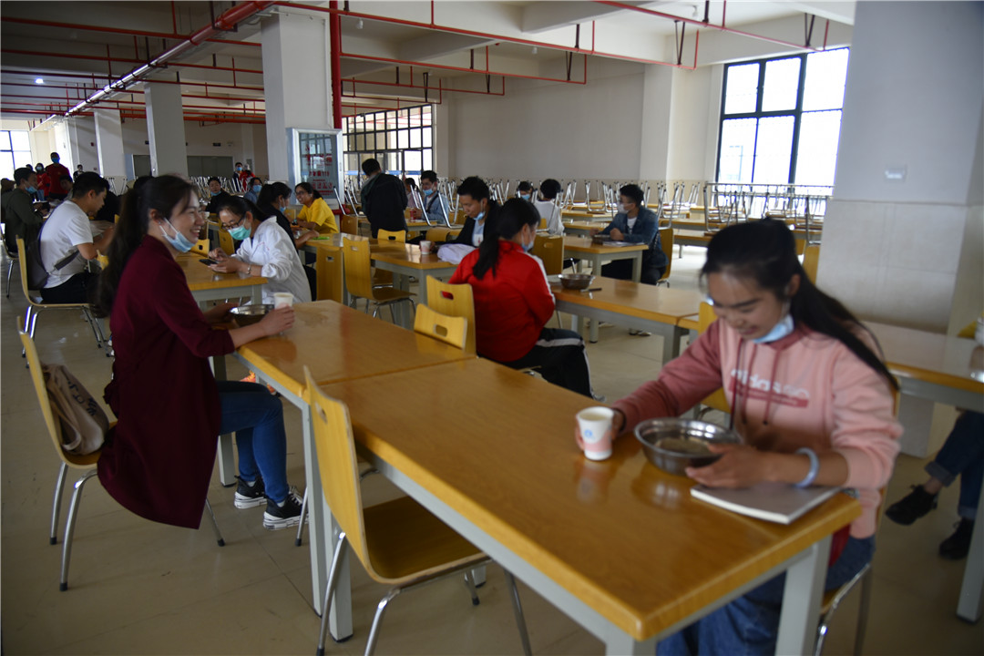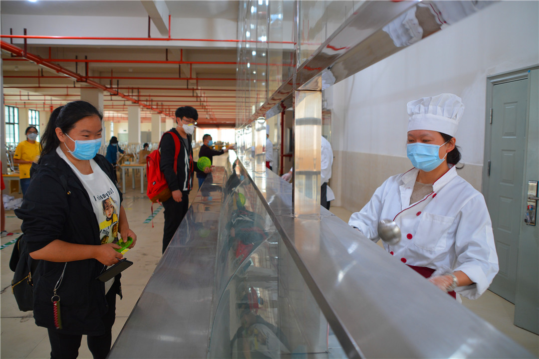 疫情期间,进入餐厅的师生须在餐厅外进行餐前洗手,戴口罩进入食堂,行进间拉开1米以上距离,各食堂配备学生志愿者对就餐人员进行秩序维护。餐厅管理人员实时掌握各楼层就餐人员情况,餐厅各楼层人员饱和时,暂时停止人员进入餐厅。