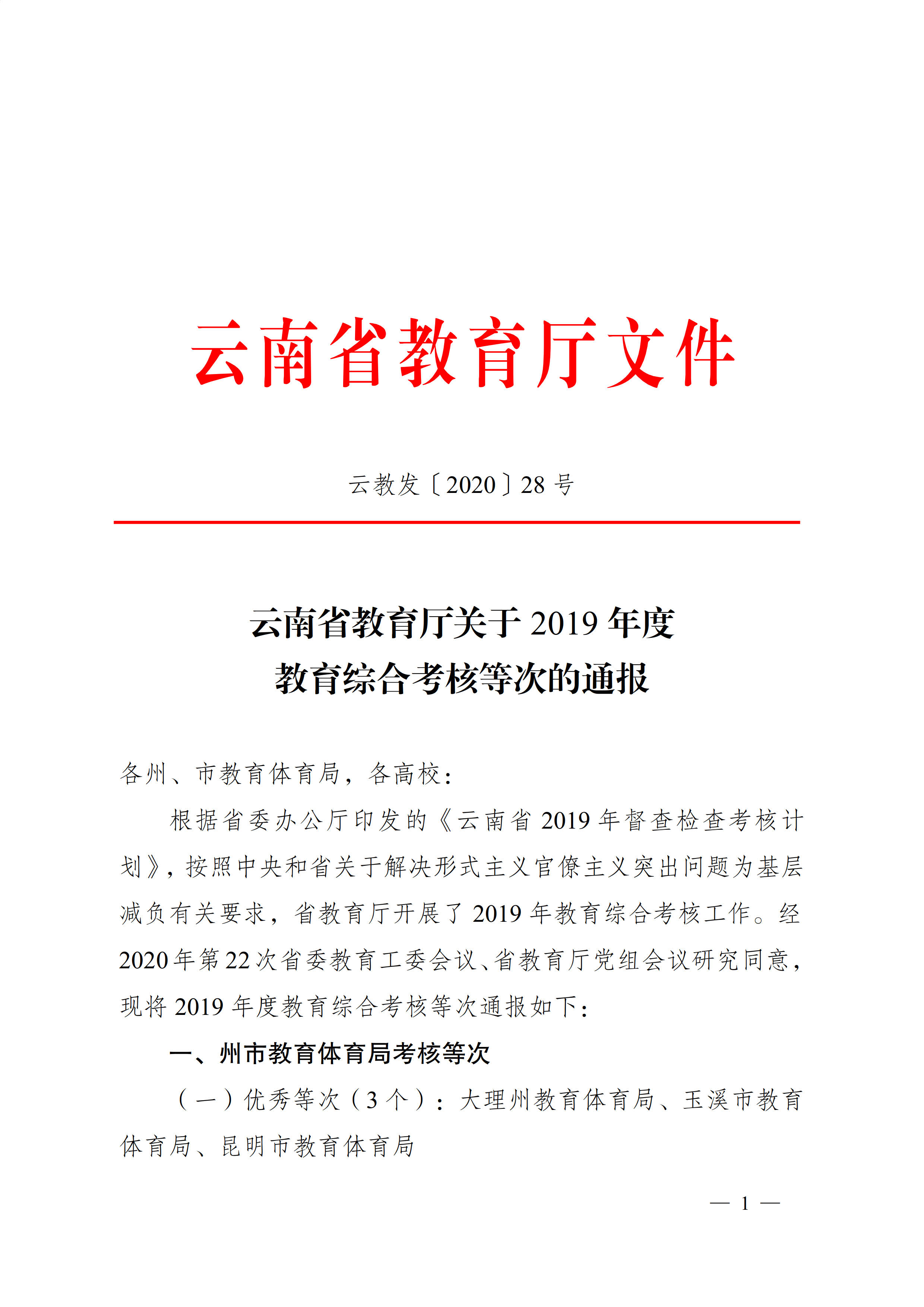 近日,经2020年第22次省委教育工委会议、省教育厅党组会议研究同意,云南省教育厅发布了《关于2019年度教育综合考核等次的通报》(云教发〔2020〕28号)。XK星空在2019年度云南省教育厅教育综合考核中被评定为高职(专科)学校考核等次“良好”。