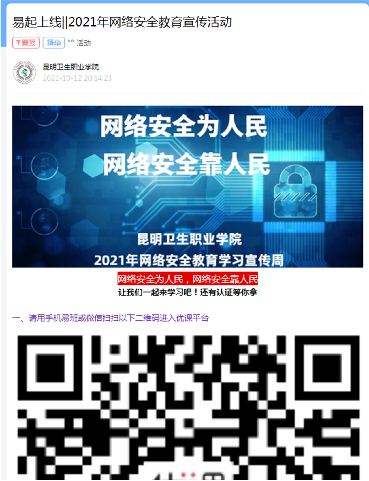 学院易班学生工作站利用平台优势积极开展线上网络安全宣传教育活动:利用易班优课进行国家网络安全战略和网络安全不信谣、坚守科学不动摇的专题学习,并通过易班网平台深入学习网络安全知识,逐步加强大数据环境下个人信息安全保护,提升师生网络安全意识,营造清朗的网络环境。