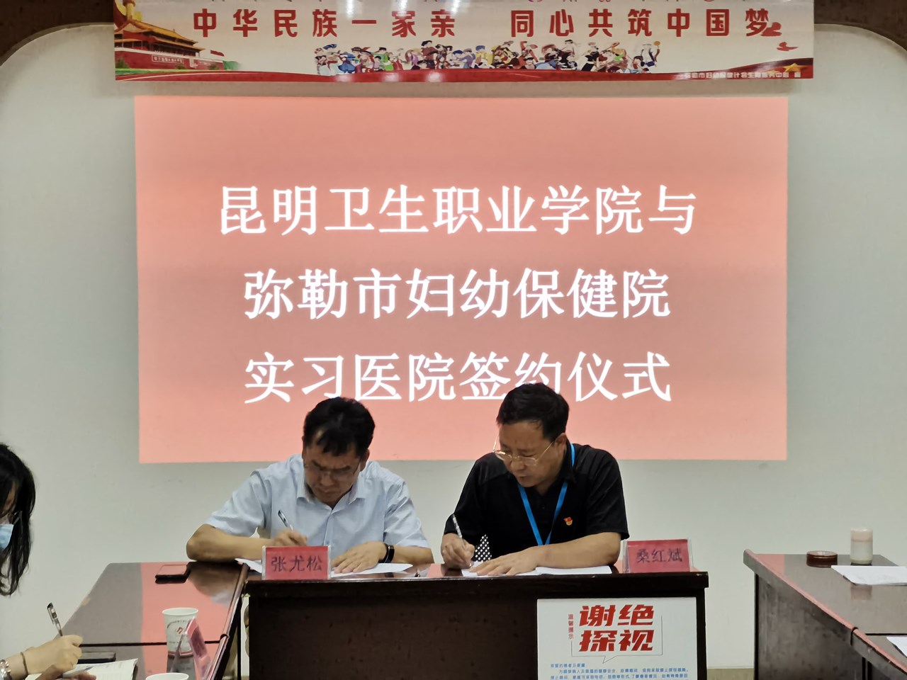 最后,张尤松副院长与弥勒市妇幼保健院桑红斌院长签署了《建立实习医院关系协议书》,医院领导携张尤松副院长一行到医院各科室进行参观,院校领导及代表合影留念。