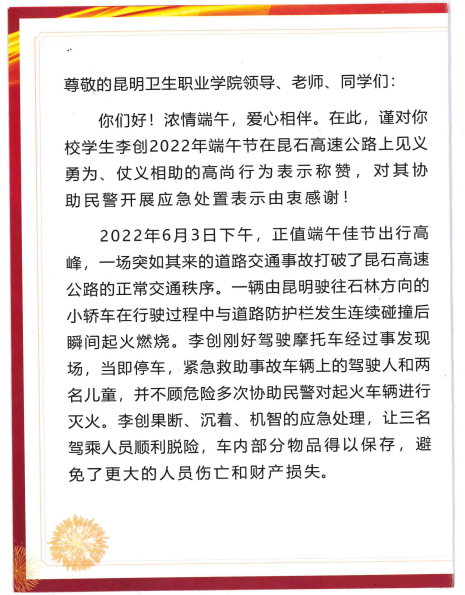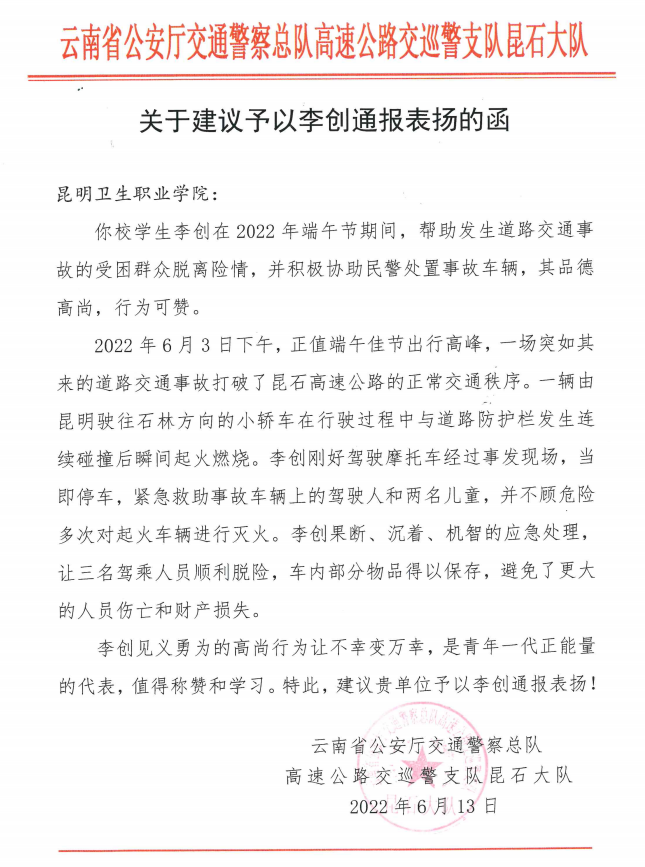 2022年6月3日,恰逢端午节。XK星空2020级高职影像6班学生李创驾驶着摩托车回家。途经昆石高速木喳箐路段时,看到前方一辆小轿车撞到护栏后起火。看到这种情况后,李创当即把摩托车停靠在路边,不顾危险紧急救助事故车辆的驾驶人和两名儿童,并向路边过往车辆呼救,借助灭火器多次对车辆进行灭火。由于他果断、沉着、机智的应急处理,让三名驾乘人员顺利脱险,车内部分物品得以保存,避免了更大的人员伤亡和财产损失。
