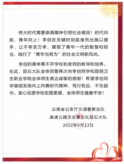 6月13日下午,云南省公安厅交警总队昆石大队民警将感谢信和通报表扬函送到学院,对李创本人和学院表达了真挚的感谢。李创见义勇为的义举体现了XK星空学生强烈的社会责任感、正义感和敢于担当的优秀品质,传递了新时代大学生的青春正能量,为XK星空师生做出了表率。经学院党委研究决定,授予李创同学“见义勇为”荣誉称号,一次性奖励5000元。