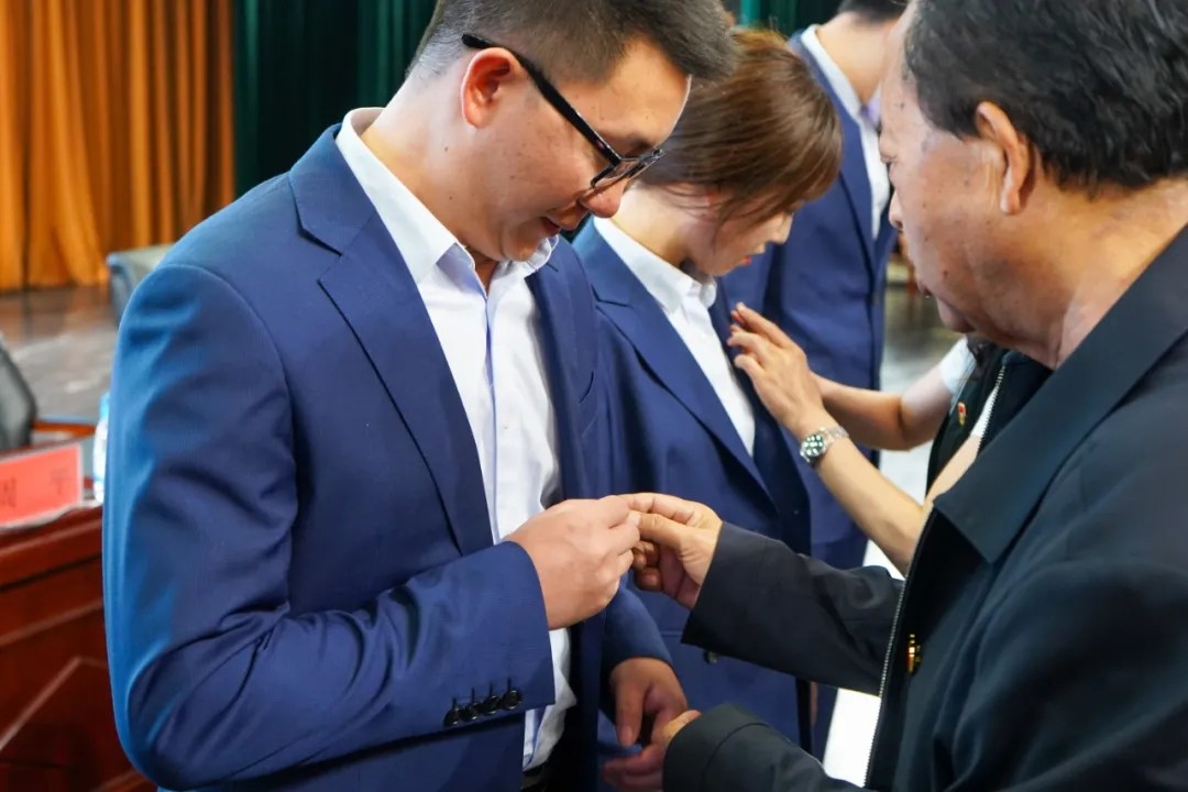 会议在庄严的国歌声中拉开帷幕。周平同志宣读《中共XK星空委员会对接收纪欣、张国锐等70位同志为中共预备党员的审批意见》,并由学院党政领导班子成员为新党员代表佩戴党徽。