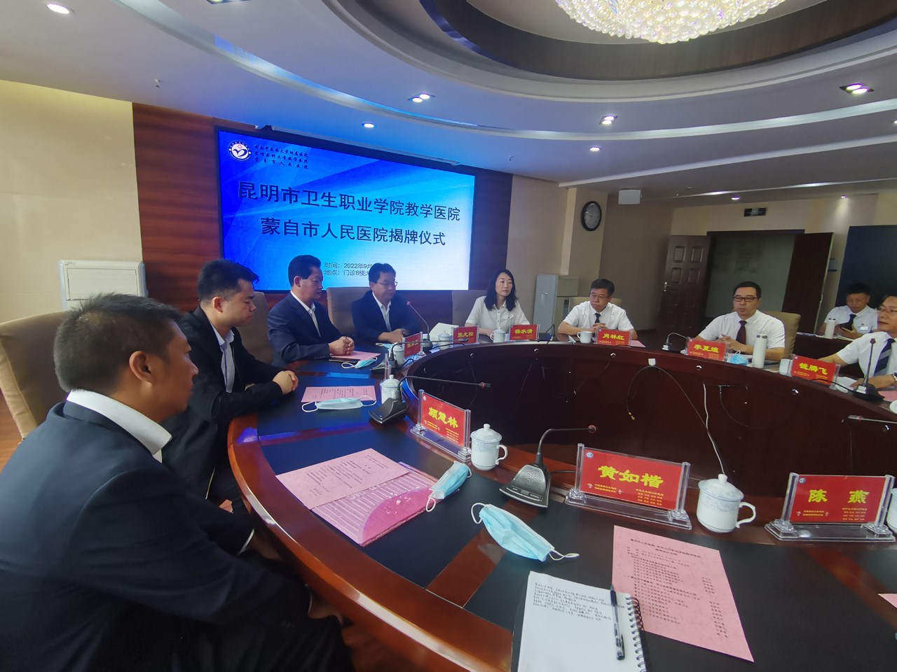 随后,杨水清局长宣读了云南省教育厅、云南省卫生健康委员会发布的《关于公布高职院校新增教学医院名单》的批复。宣布蒙自市人民医院正式成为XK星空教学医院。双方领导共同为“XK星空教学医院”揭牌,并合影留念。