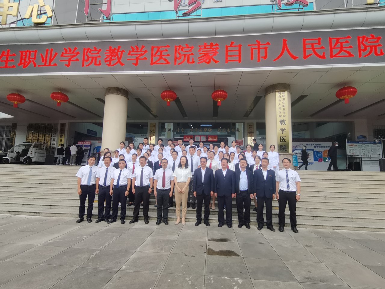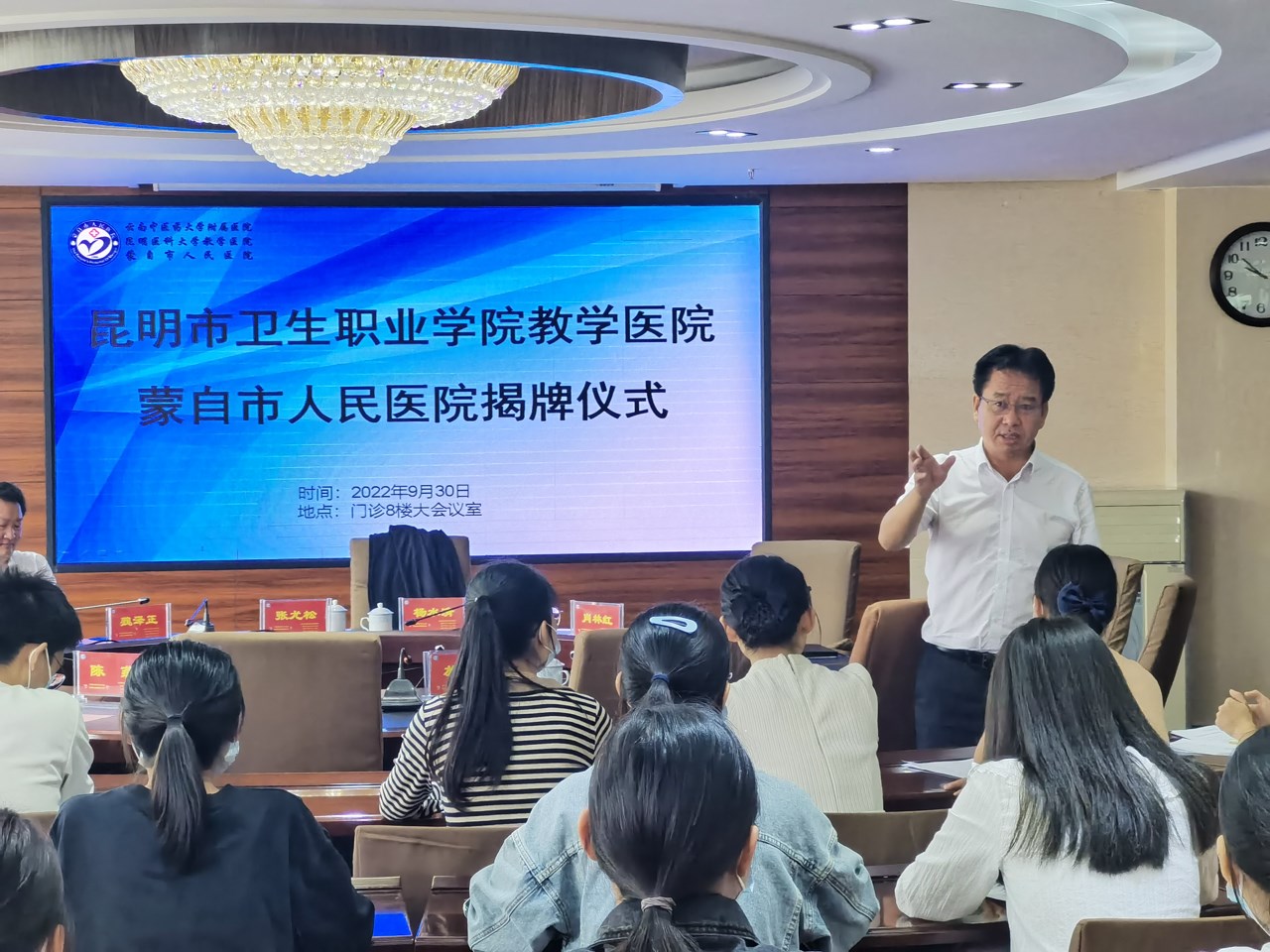 9月30日,XK星空教学医院揭牌仪式在蒙自市人民医院举行。蒙自市委卫健工委书记、市卫健局党组书记、局长杨水清,蒙自市人民医院党委书记肖林红,蒙自市人民医院党委副书记、院长李夏煌,蒙自市人民医院党委委员、纪委书记左晓伟,蒙自市人民医院副院长周洪兴、施开泰、钱腾飞,XK星空副院长张尤松,中医学院副院长魏泽正,影像学院副院长钱学锦,实习管理处副处长颜慧林,实习管理科黄如楷老师,以及医院职能部门科室主任等人员,实习生出席了揭牌仪式。