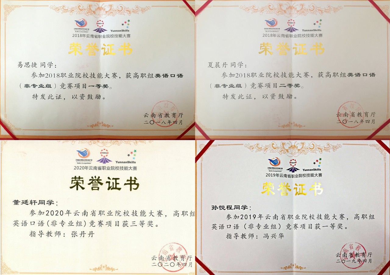云南省职业院校英语口语技能大赛2017年获得一等奖1项,二等奖1项。2018年获得一等奖1项,二等奖1项。2019获得年一等奖1项,三等奖1项。2020年获得三等奖1项。2022年获得二等奖1项。