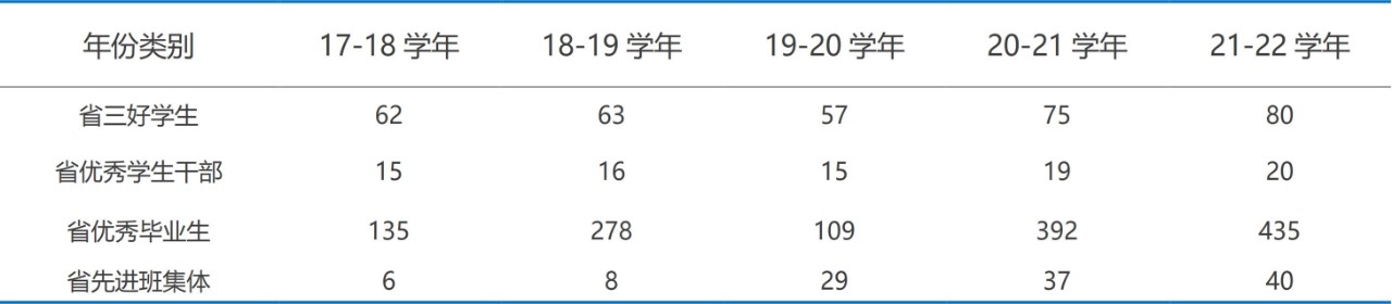 发挥评先评优在学生队伍建设中的作用,近五年以来,积极组织师生积极参与省级三好学生等各类评先评优,多名学生获得相关荣誉称号。近五年以来获得省级表彰三好学生337人,优秀学生干部85人,优秀毕业生1349人,先进班集体120个。历年表彰情况如下: