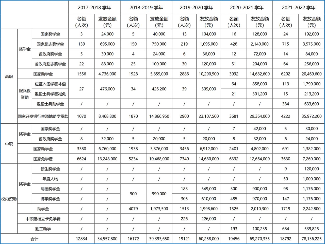 近五年以来完成各类中高职奖助评选及资金发放,未发生任何特大事故。近五年以来完成各类中高职奖助评选及资金发放,未发生任何特大事故。五年来国家奖学金高职1712人,金额874.3万,中职12人,金额7.2万;省级奖学金高职233人,金额101.4万,中职32人,金额12.8万;国家助学金高职16504人,金额5603.81万,中职11866人,金额2373.2万;国家助学贷款13743人,金额1.1亿;服兵役资助697人,金额520.72万;中职国家免学费21960人,金额5832万;校内奖学金2477人,金额749.1万;校内助学金8836人,金额822.52万;校内勤工助学877人,金额64.006万;校内建档立卡户免学费226人,金额22.6万。