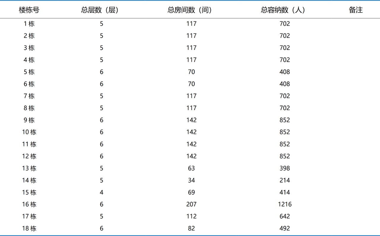 2017年至2018年,XK星空学生公寓有1-18栋,总计18栋学生公寓,覆盖XK星空1期和2期两个片区,总容纳量为11812生。具体如下: