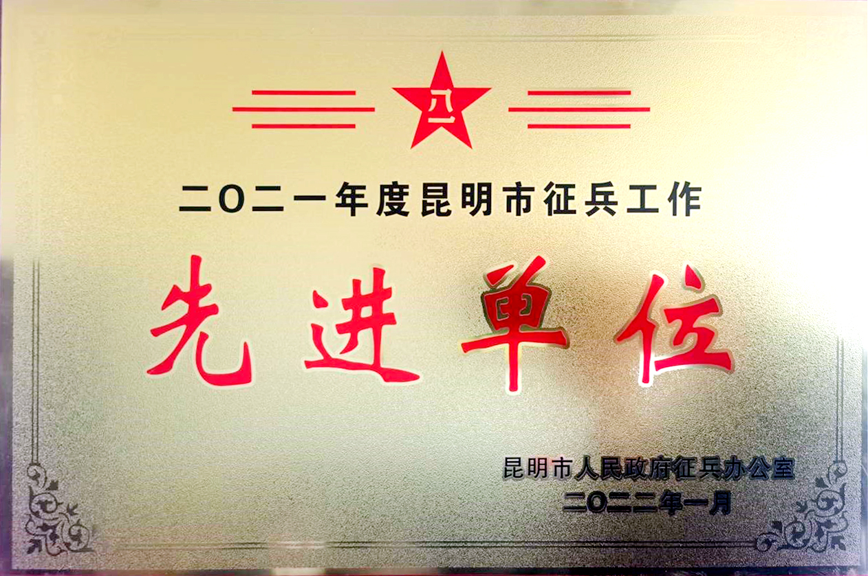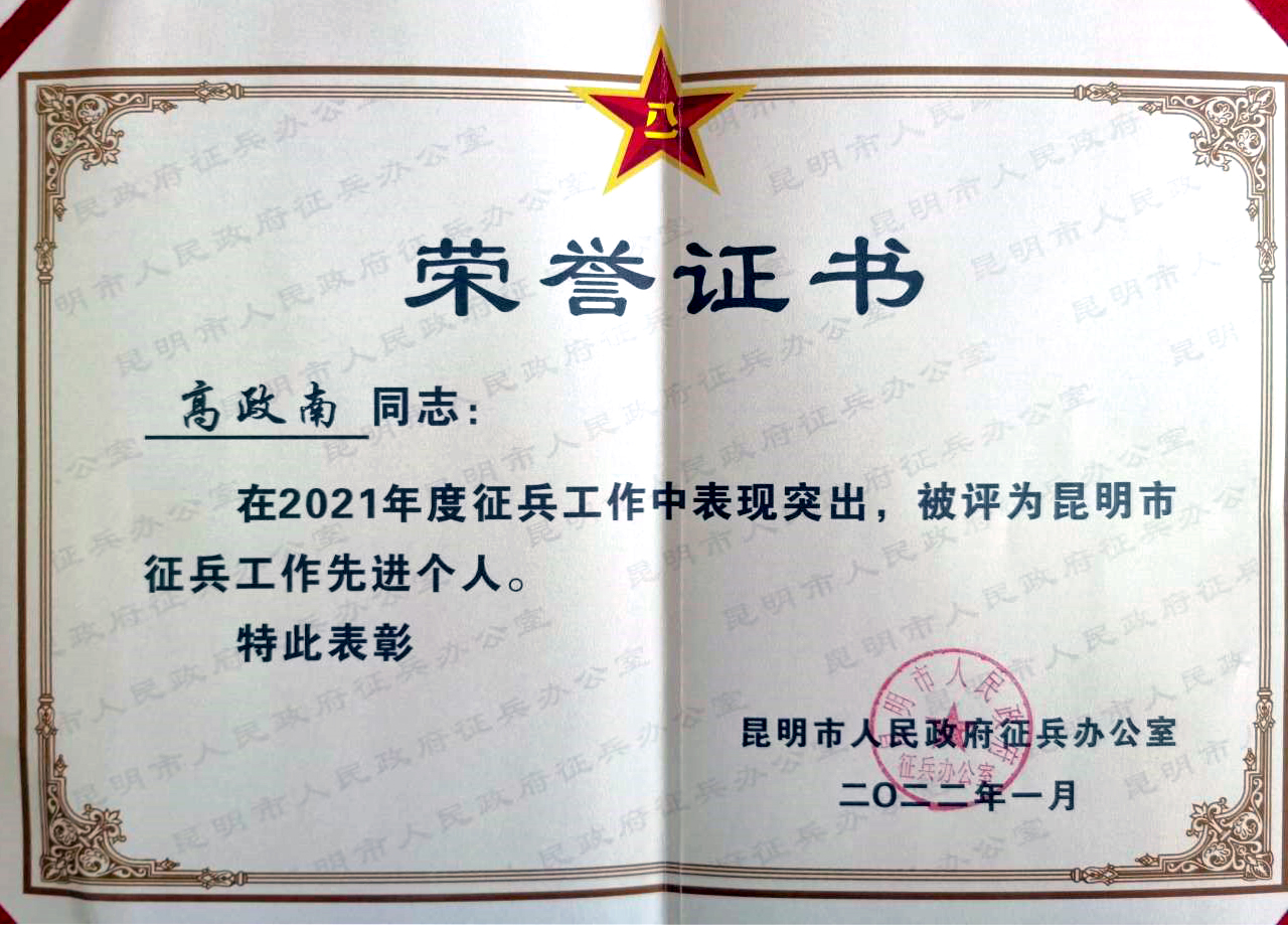 2017年云南省征兵办公室下发学院全年征兵任务17人,入伍人数26人,学院人民武装部人武科科长熊中秋同志被昆明市人民政府征兵办公室评为昆明市先进征兵个人。