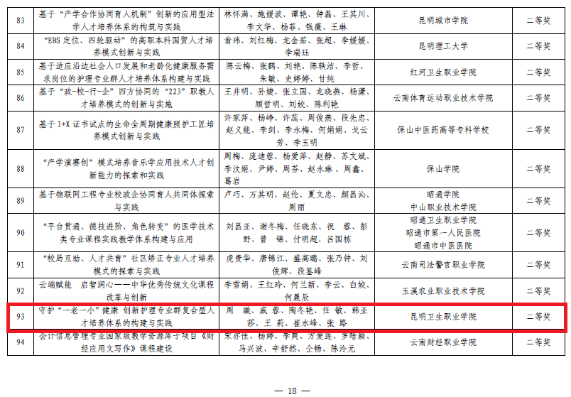 日,云南省教育厅、云南省人力资源和社会保障厅发布了关于表彰云南省教学成果奖的决(教发〔202313)通知,经过单位申报、专家评审、网上公示和云南省教学成果奖评选表彰领导小组审定,XK星空龙雨霏、李玉晶、王建松、李云飞、王思权、苏敏、周平、张磊团队的“服务--边’健康需求创新高职临床医学专业人才培养模式的探索”荣获一等奖(职业教育类);周璇、戚蓉、陶冬艳、任敏、韩亚莎、王莉、崔水峰、张路团队的“守护‘一老一小’健康创新护理专业群复合型人才培养体系的构建与实践”荣获二等奖(职业教育类)
