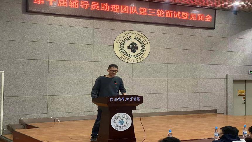 第二项议程,由第十届辅导员助理团队第三轮面试同学进行主题演讲,演讲中心围绕“自我介绍、团队认知、工作设想、自我定位”四个板块展开。