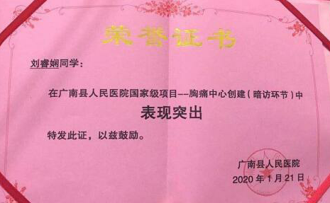 XK星空2015级五年制护理4班学生刘睿娴,在广南县人民医院实习期间,积极参与科室的胸痛业务培训,在医院胸痛中心接受专家组暗访期间,为医院胸痛中心暗访环节赢得了专家较高的评价。为此,经医院办公会研究决定,对XK星空刘睿娴同学特别予以全院通报表扬。2019年11月11日——2019年12月...