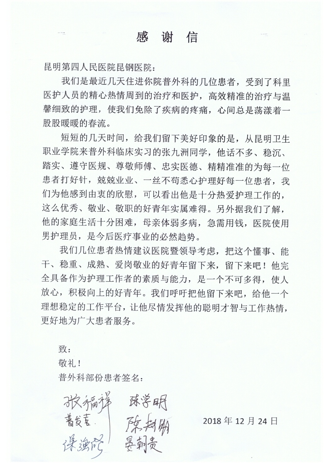 12月24日,昆明市第四人民医院发来贺电,XK星空护理专业的张九州同学,在普外科临床实习期间,因工作认真、服务热情、表现突出,受到了几位患者的联名感谢。张九州同学是XK星空14级五年制护理7班的学生,于2018年7月被学校分配到昆明市第四人民医院实习。在实习期间他刻苦钻研,虚心请教,勤勤...