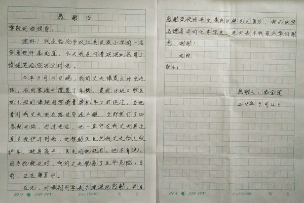 近日,XK星空收到一封来自临沧市双江县民族小学教师李金莲的感谢信。8月18日晚,李金莲老师的丈夫俸贵云外出吃饭,在回家的途中不幸遭遇了车祸。XK星空18级口腔医学专业7班的俸翔同学正好骑车经过,当他看到有人倒在路边昏迷不醒,立即拨打了120急救电话。打过电话后,俸翔同学一直守在俸贵云身旁...
