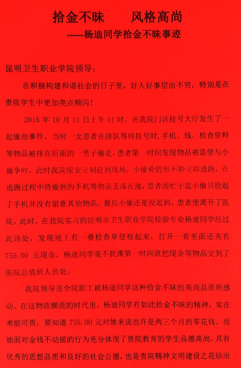 官渡区人民医院发来XK星空实习生杨迪同学拾金不昧表扬信