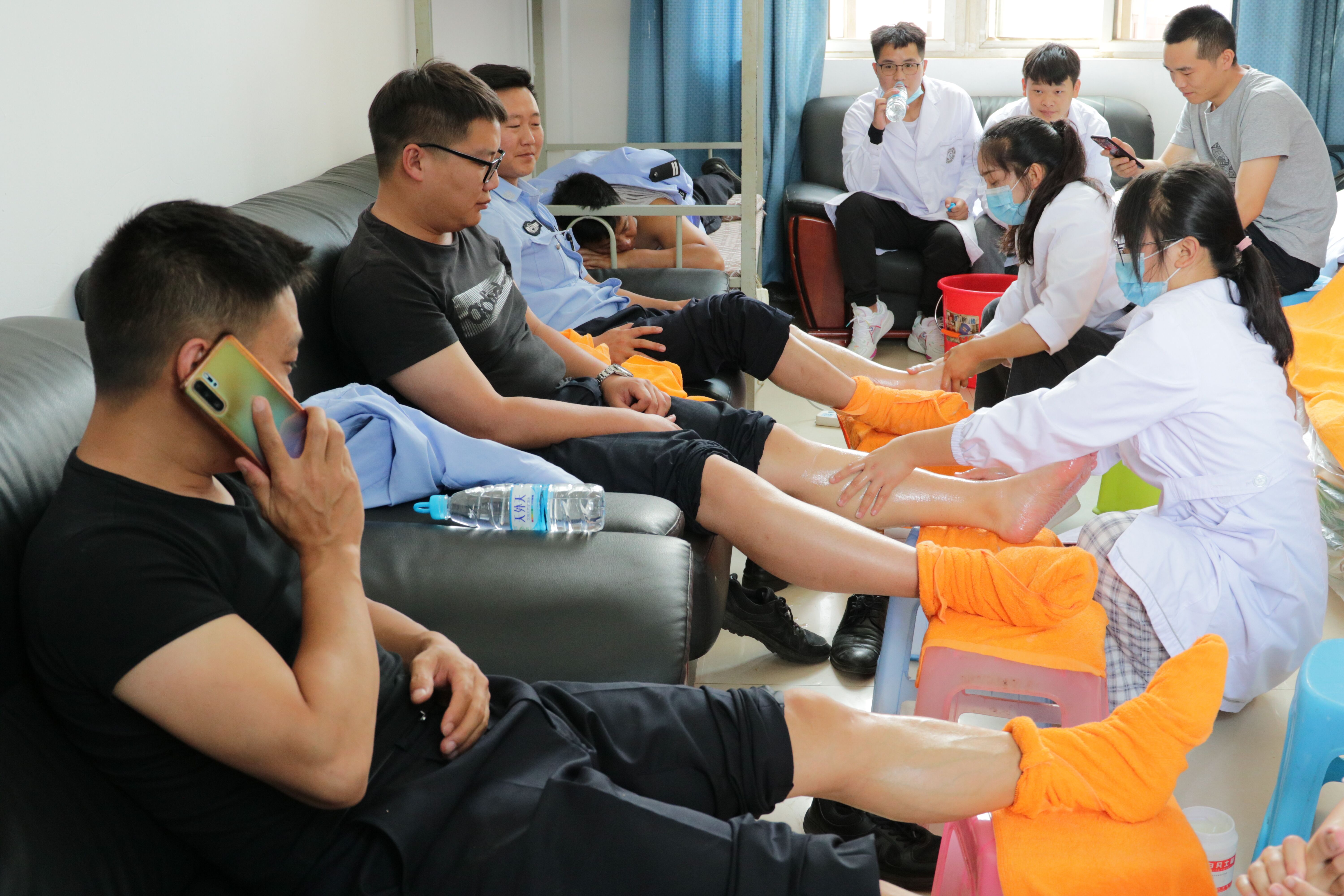 学院理疗团队的同学们结合专业特色,让晋城镇派出所的100位民警依次体验了推拿、足疗、拔火罐、艾灸等传统中医理疗项目。