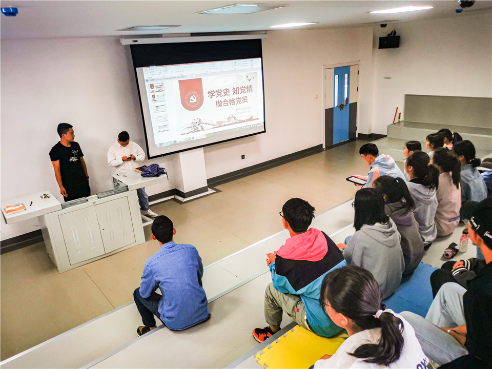 活动第二环节以别出心裁的形式迎接建党100周年。入党积极分子王俊生同学饱含深情的朗诵了现代诗《传单》,赞扬了仁人志士对党和祖国的忠诚和热爱,赢得了阵阵热烈的掌声;预备党员鲁建杉同志百年党史征程演讲深入人心,从在中国共产党的领导下中国人民开天辟地、改天换地、翻天覆地以及惊天动地四个方面讲述了党的百年征程波澜壮阔,百年初心历久弥坚;预备党员杨晗、王娆、王紫琛三位同志以小品的形式给我们再现了“抗战时期师生播撒革命火种”、“新中国成立后,各民族在党的正确领导下投入社会主义建设”、“中国特色社会主义进入新时期,奋力夺取脱贫攻坚战全面胜利”三幕历史剧,以表演的形式带我们回顾历史,缅怀先辈,展望未来,时刻警醒我们不忘初心,牢记使命跟党走。