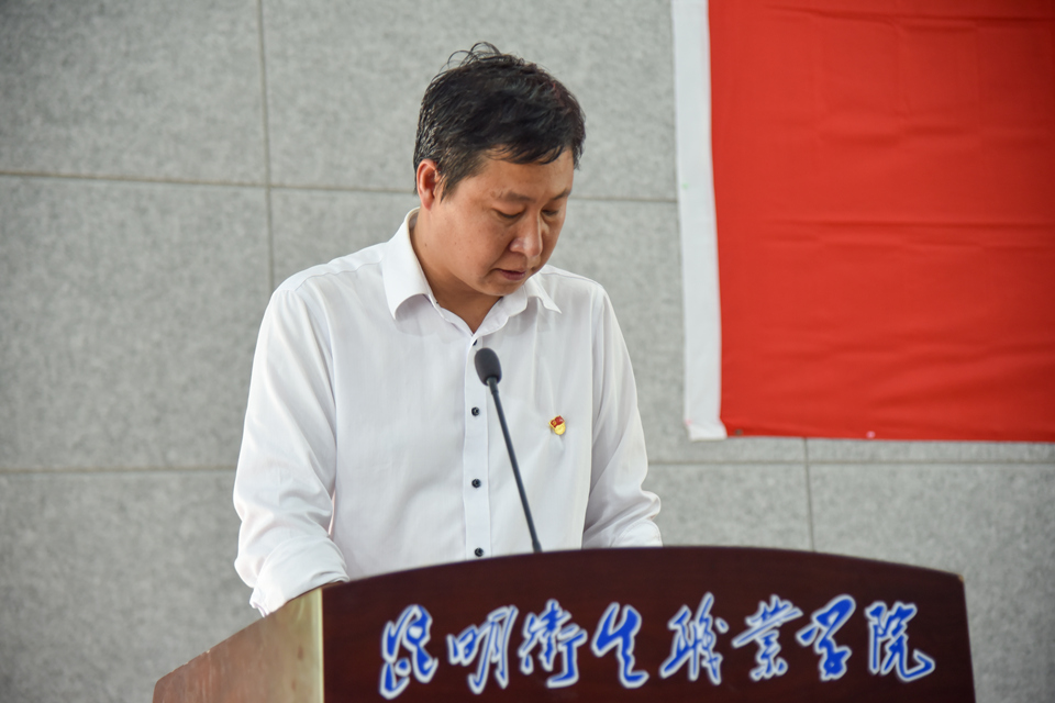 伴着着庄严的《国际歌》,入党宣誓仪式正式开始。党委副书记张晓刚同志宣读了参加入党宣誓的预备党员名单,随后新党员面向党旗,举起右手,在组织部副部长李睿雯同志的领誓下,用慷慨激昂的语气,庄严向党旗宣誓,表达对党的忠诚、为共产主义事业奋斗终身的决心。随后,2019级高职护理2班陈丹代表新党员发言,她表示通过入党宣誓仪式体会到加入党组织的神圣,受到了精神的洗礼,更加坚定了她为共产主义事业奋斗终身的信心和决心,在今后的学习、工作和生活中她将按照党员的标准严格要求和鞭策自己,加强理论知识学习,提高专业素养,努力做好本职工作,以身边优秀党员作为学习的榜样,时刻保持共产党员的先进性和先锋模范作用,用实际行动争做一名优秀的共产党员。