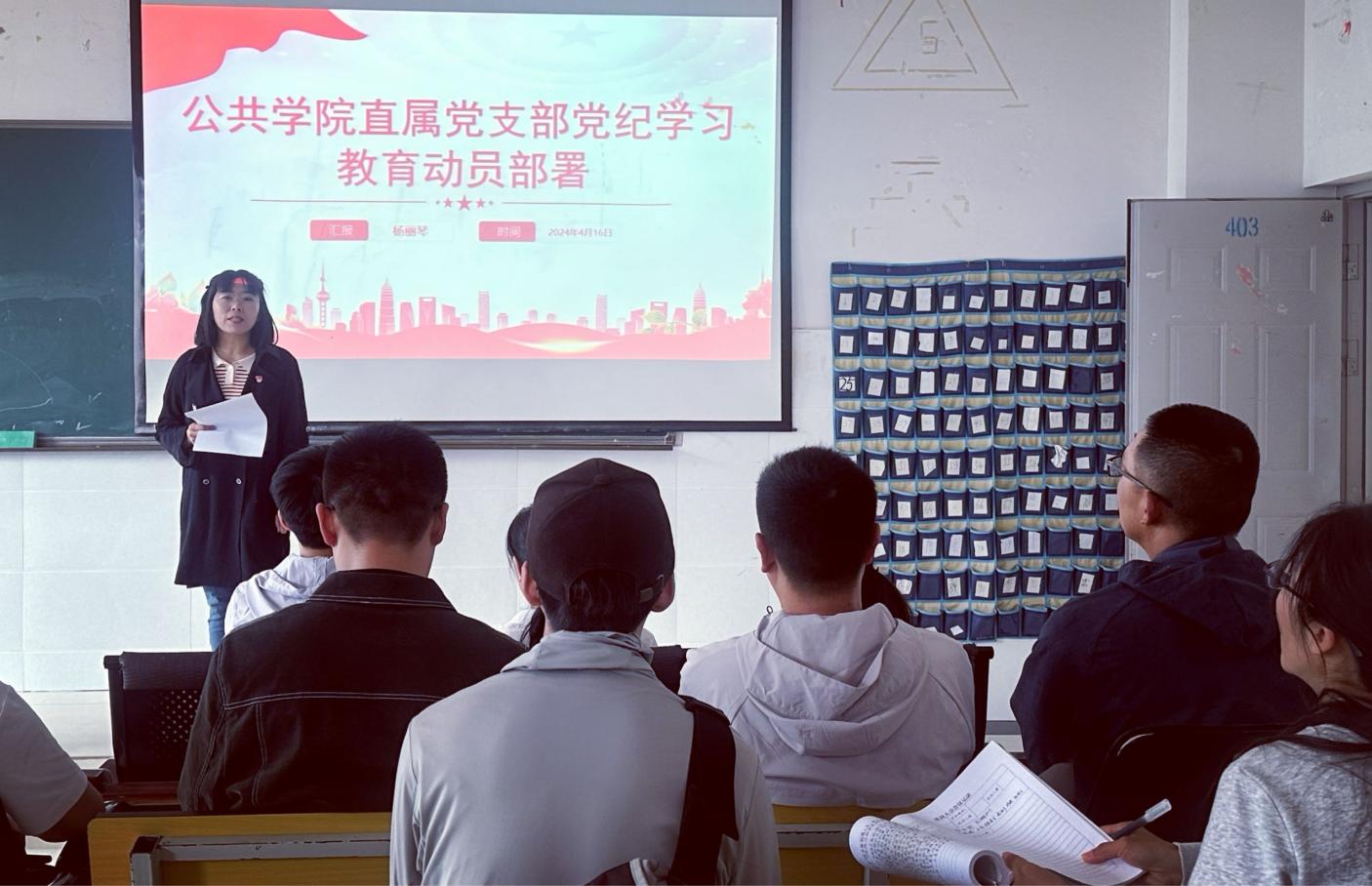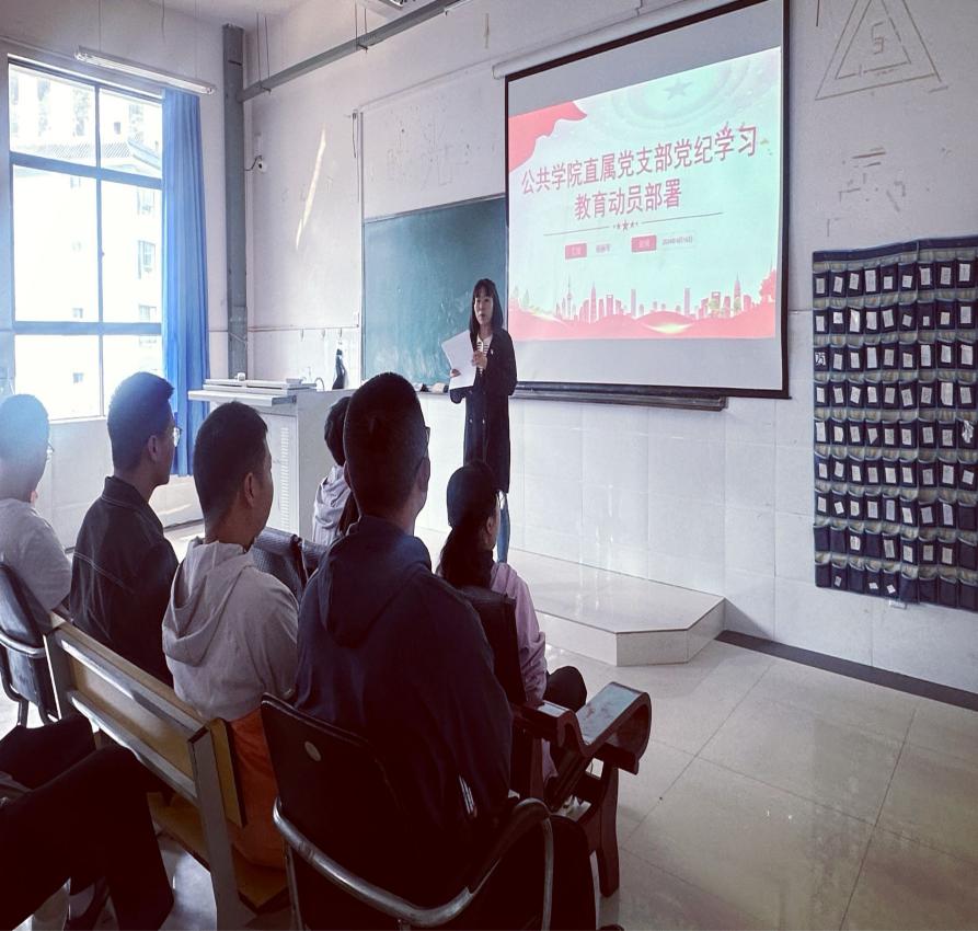 为深入学习贯彻习近平总书记关于党纪学习教育的重要讲话和重要指示精神,扎实开展党纪学习教育,教育引导支部全体党员学纪、知纪、明纪、守纪,使广大党员深入理解和把握党的纪律规定,营造风清气正的政治生态环境,进一步坚定理想信念,锤炼党性修养,践行初心使命。4月16日,公共学院直属党支部召开党纪学习教育动员部署会,会议由支部书记杨丽琴主持主讲。