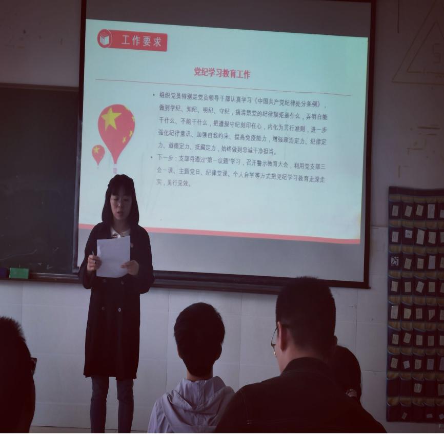 会上,杨丽琴传达了中央党的建设工作领导小组和省委、省委教育工委和学校党委关于开展党纪学习教育的有关文件和会议精神,就支部开展党纪学习教育作动员部署。这次党纪学习教育,是加强党的纪律建设、推动全面从严治党向纵深发展的重要举措。党中央高度重视,习近平总书记多次就开展党纪学习教育发表重要讲话、作出重要指示,为开展党纪学习教育提供了重要遵循。杨丽琴要求全体党员要深入学习贯彻习近平总书记的重要讲话和重要指示精神,落实《关于在全党开展党纪学习教育的通知》要求,深刻领悟“两个确立”的决定性意义,坚决做到“两个维护”,切实把思想和行动统一到党中央决策部署上来。