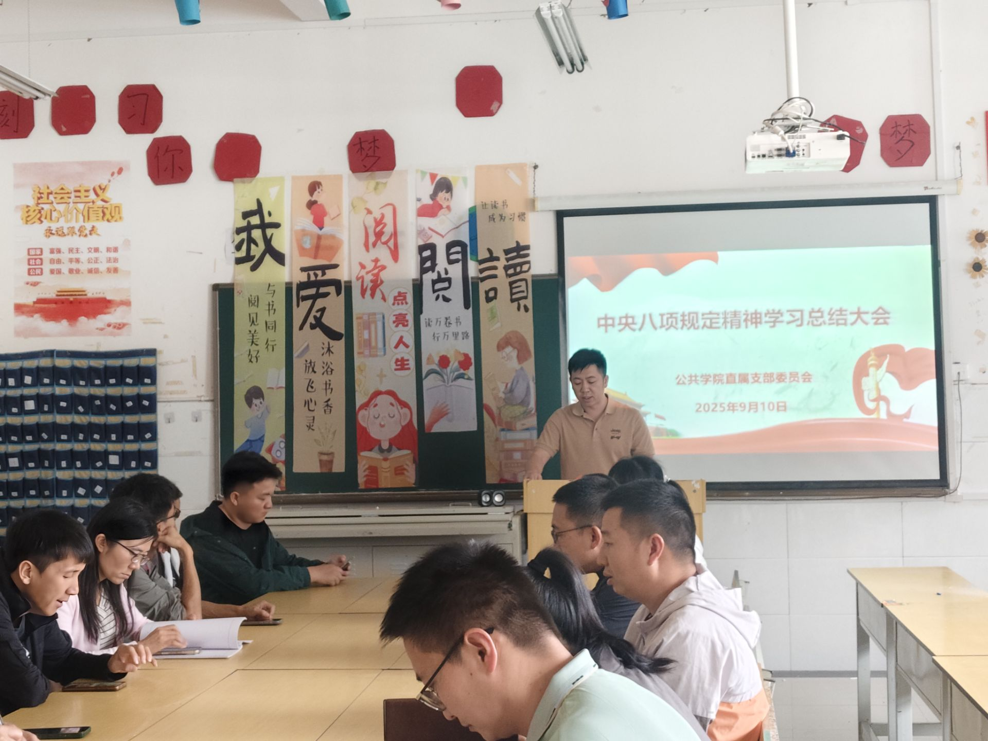 2025年9月10日,恰逢第41个教师节,公共学院直属支部委员会召开中央八项规定精神学习总结大会。支部全体党员齐聚公共学院会议室,共同回顾学习历程、总结实践成果、谋划后续方向,为学院高质量发展筑牢作风建设思想根基。会上,支部书记王正安同志系统回顾了中央八项规定精神学习过程,总结学习收获。