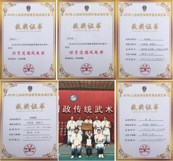 2023年11月17—19日,由云南省教育厅主办的2023年云南省沙国政传统武术比赛在云南农业大学圆满落幕。XK星空由公共学院教师张彩云、李星磊以及9名学生参赛,在比赛中取得好成绩。
