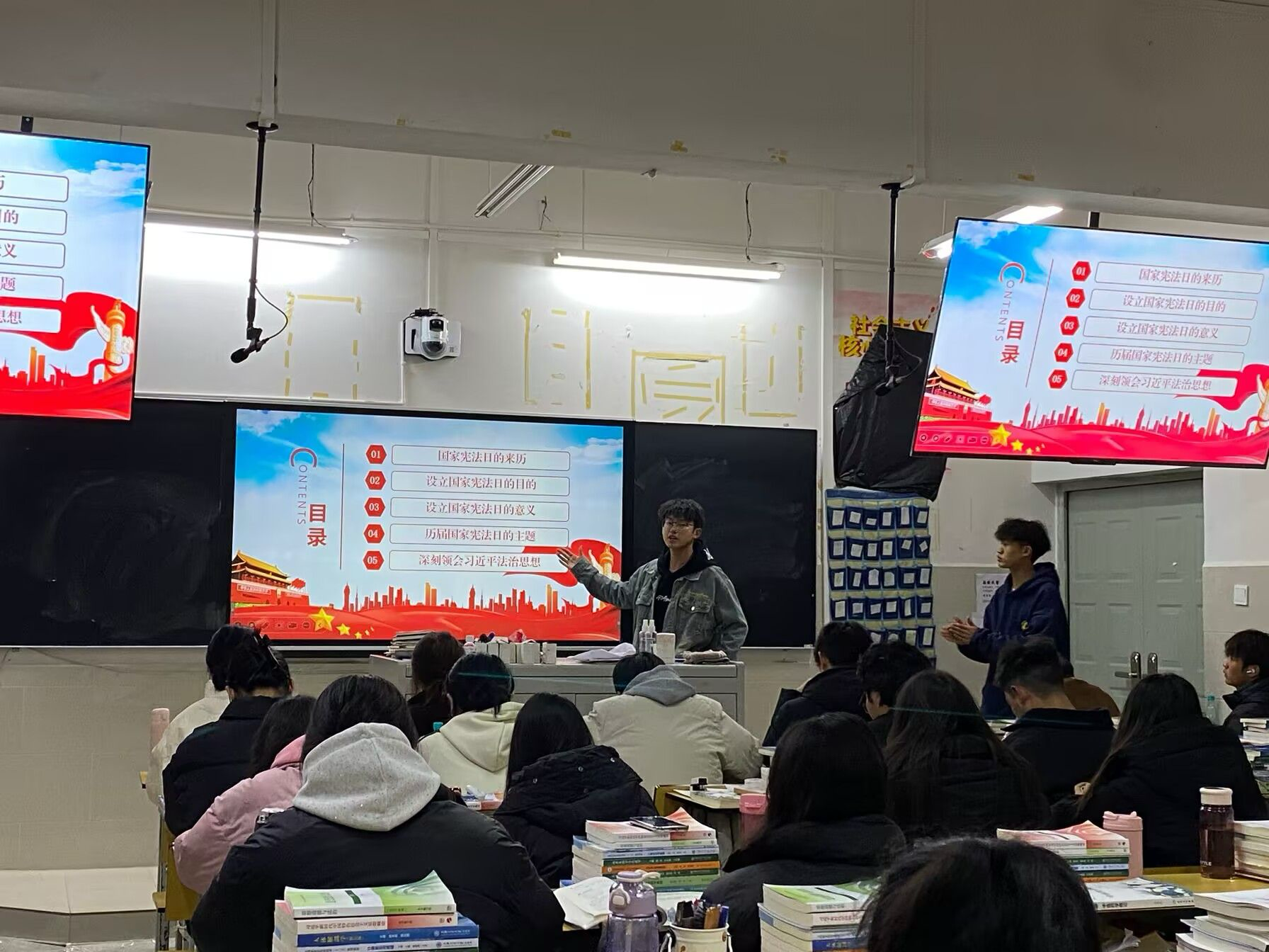 团支书们以生动的讲解,向同学们阐述了宪法作为国家根本大法的重要地位和深远意义。从国家宪法日的设立背景与来历,到其在法治建设进程中的关键作用,使同学们深刻认识到宪法与每个人的生活息息相关。在讲解过程中,还回顾了历届国家宪法日的主题,展示了我国法治建设的坚实步伐与明确方向。同时,着重强调了习近平法治思想对于当下弘扬宪法精神、推动全面深化改革的核心引领作用,让同学们理解在新时代背景下,宪法精神如何贯穿于国家发展的各个层面,以及全面深化改革与宪法实施之间的紧密联系与相互促进。