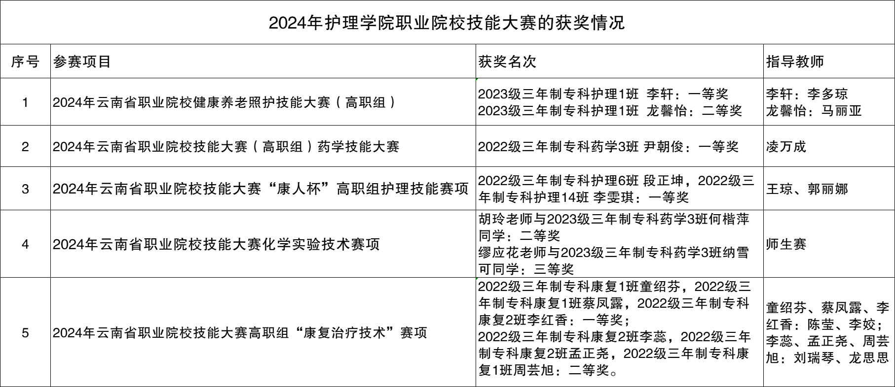 在2024年云南省职业院校技能大赛中,护理学院师生凭借出色的发挥,斩获一等奖4项、二等奖3项、三等奖1项。