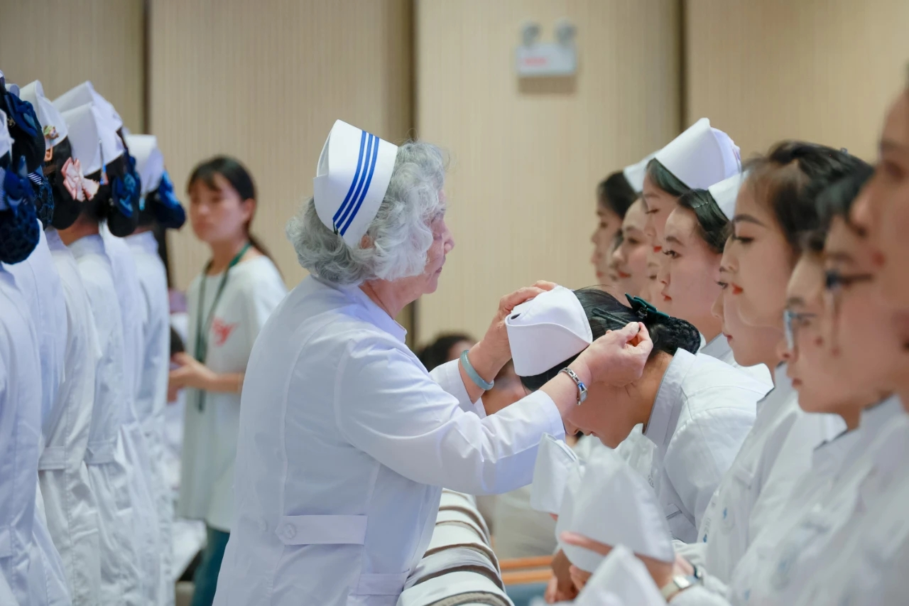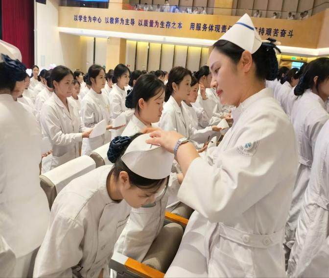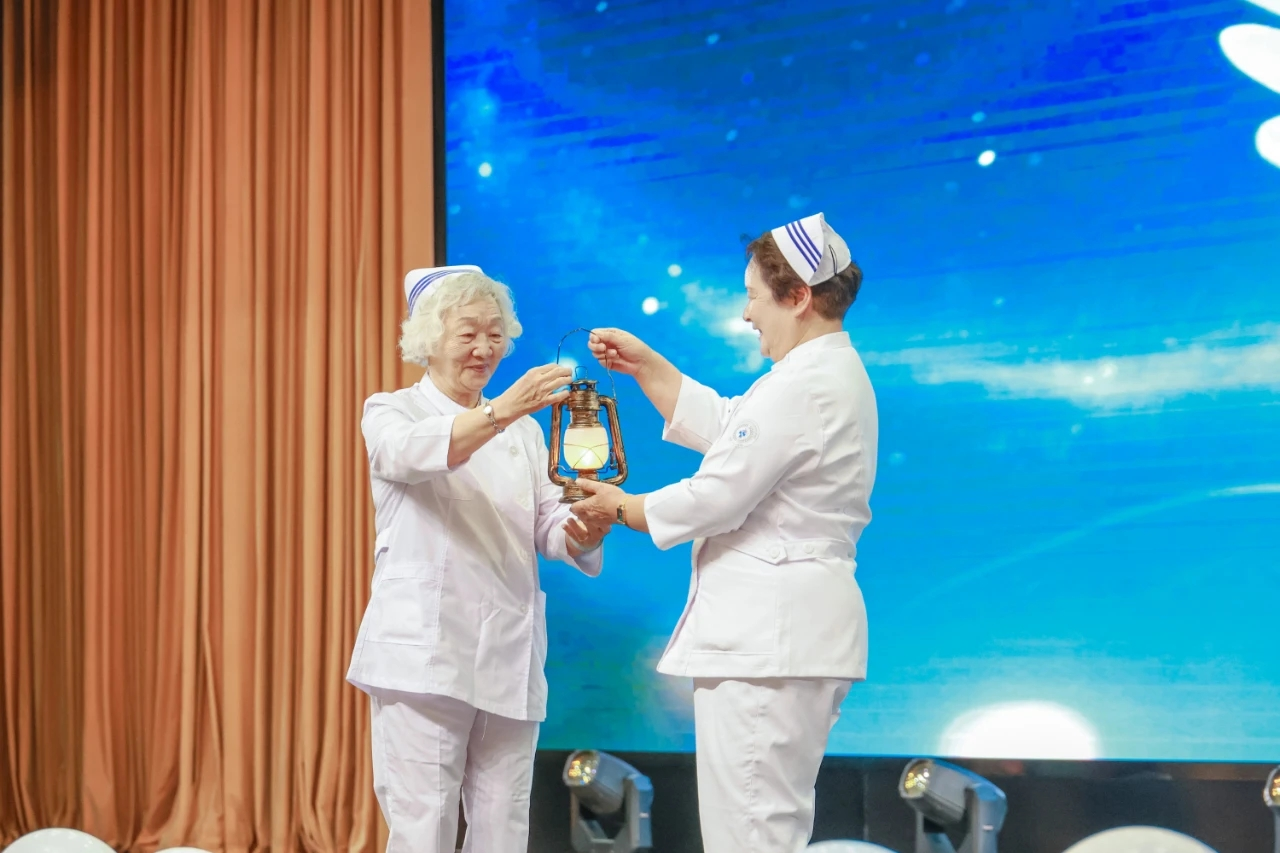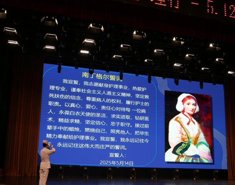 授帽仪式是本次晚会的重要环节。各位依次为护生戴上圣洁的燕尾帽。这不仅是一顶帽子的交接,更是南丁格尔精神的传承,象征着护理事业的薪火相传。在庄重的音乐声中,尤品素教授将“提灯”传授给蒋淑昆院长,蒋院长再次将“提灯”传授给周璇副院长,周副院长依次传给年轻教师。随后,周璇老师带领全体护生进行南丁格尔誓词宣誓。誓言铮铮,表达了护生们对护理事业的忠诚与热爱,以及为守护人类健康而奋斗的决心。