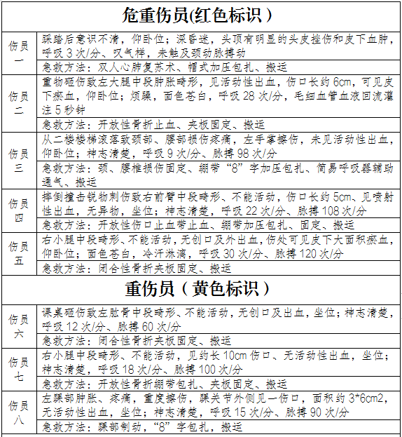 本次演习伤员共计28名,分甲、乙两个大组,每组14名伤员,分别含危重伤员5名,重伤员3名,轻伤员5名,挤压综合伤员1名。其中危重伤员用红色标识,重伤员用黄色标识,轻伤员用绿色标识。具体伤情如下: