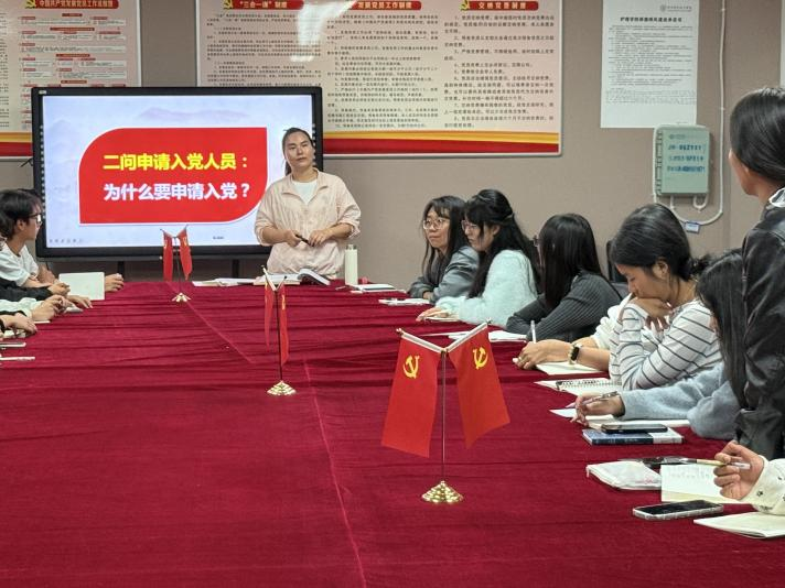 为深入贯彻党的二十大关于“加强党的建设,做好新时代党员发展工作”的部署要求,切实加强入党申请人理想信念教育,引导青年群体筑牢信仰根基、明晰入党路径,10月9日19:30,护理学院第一党支部在党员活动室开展2025年入党申请人首次专题培训,主题为“以青春之我,叩响入党初心之...