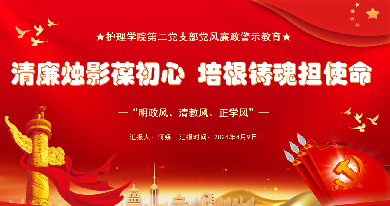 习近平总书记在二十届中央纪委二次全会上强调:“要加强新时代廉洁文化建设,涵养求真务实、团结奋斗的时代新风。”。4月9日下午17:40,护理学院第二党支部在学院党总支的号召下,组织支部全体党员开展了以“清廉烛影葆初心,培根育魂担使命”为主题的党员廉洁警示教育活动。图一:“清...