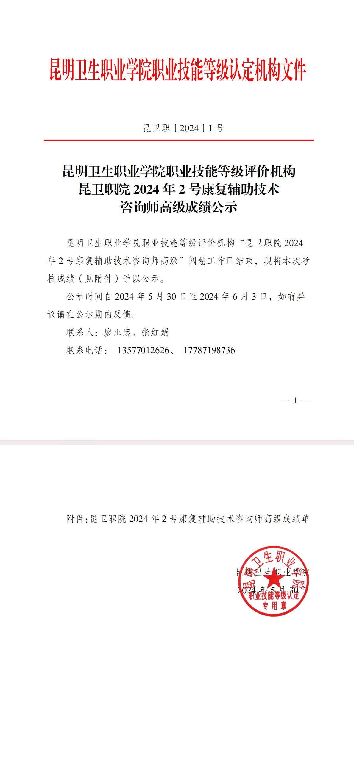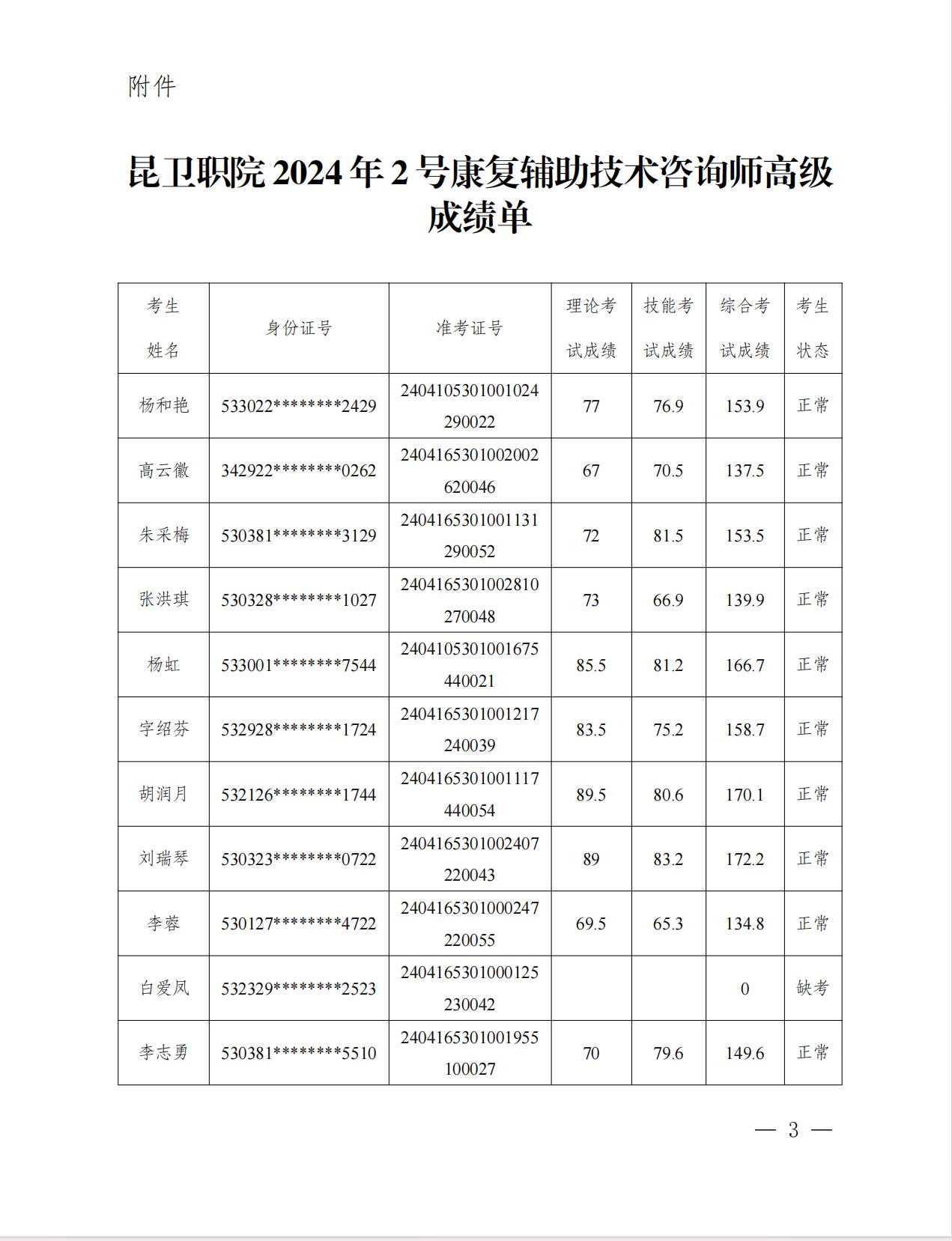 XK星空职业技能等级评价机构昆卫职院2024年2号康复辅助技术咨询师高级成绩公示