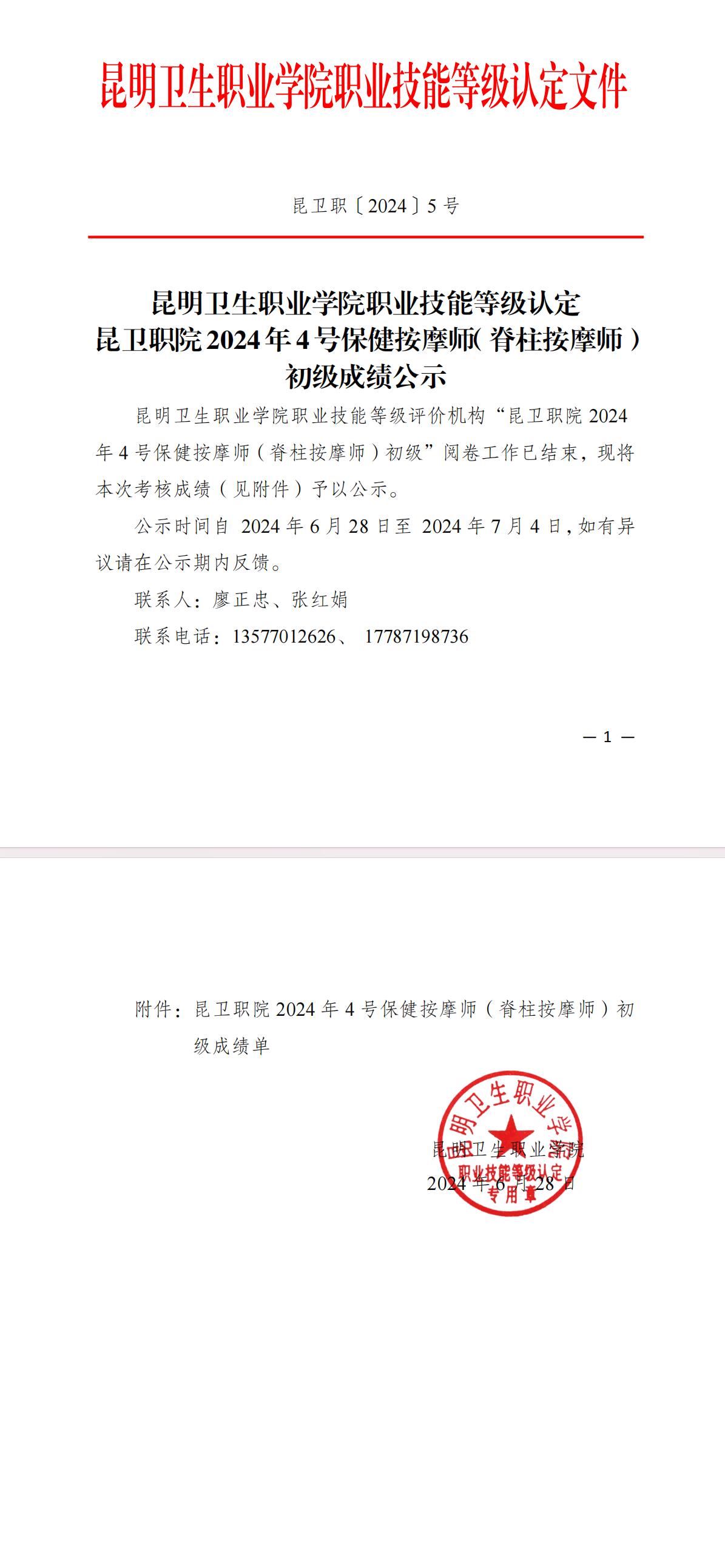 附件昆卫职院2024年4保健按摩师(脊柱按摩师)初级成绩单 - 副本.pdf